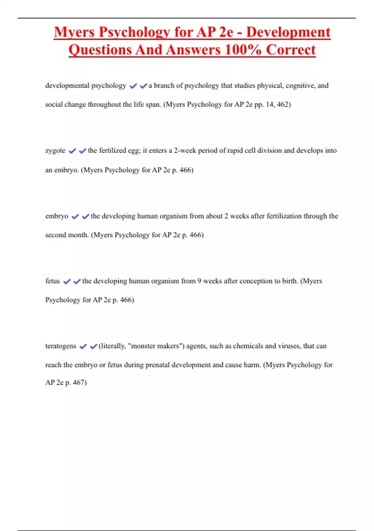 Myers Psychology for AP 2e - Development Questions And Answers 100% Correct developmental psychology a branch of psychology that studies physical, cognitive, and social change throughout the life span. (Myers Psychology for AP 2e pp. 14, 462) zygote the fertilized egg; it enters a 2-week period of rapid cell division and develops into an embryo. (Myers Psychology for AP 2e p. 466) embryo the developing human organism from about 2 weeks after fertilization through the second month. (Myers Psychology for AP 2e p. 466) fetus the developing human organism from 9 weeks after conception to birth. (Myers Psychology for AP 2e p. 466)