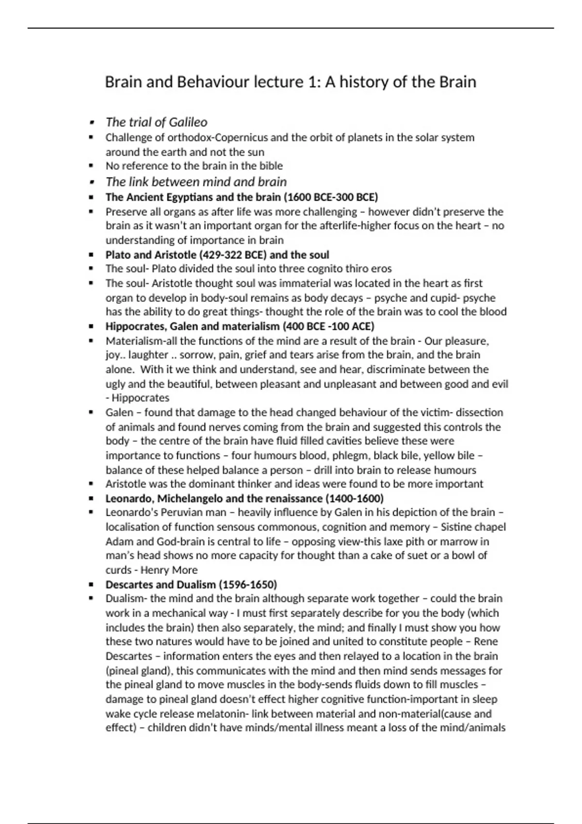 Lecture Notes on Brain and Behavior These lecture notes explore the relationship between the brain and behavior, focusing on the structure and function of the nervous system, neural communication, and the biological basis of psychological processes.