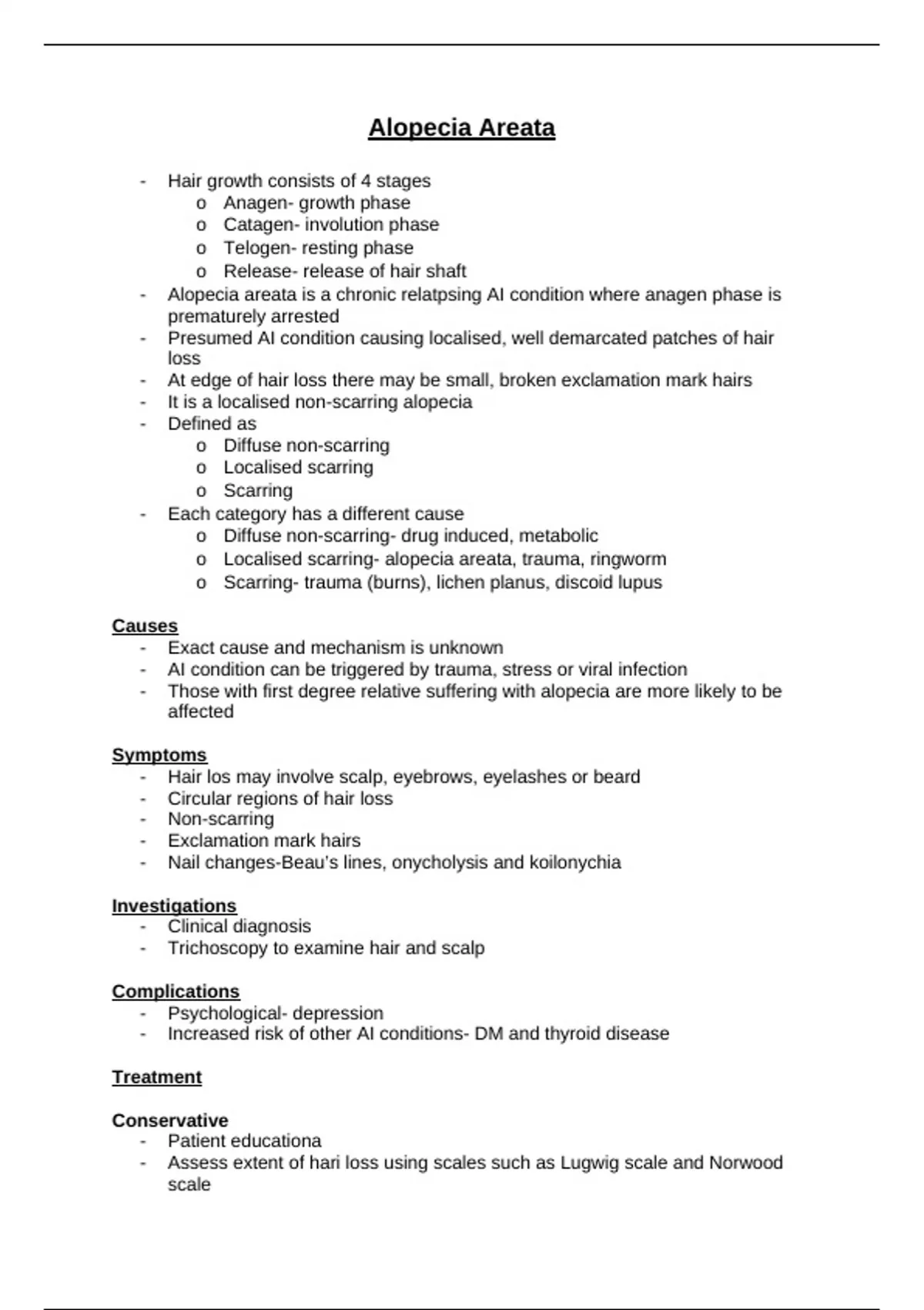 - Alopecia areata is a chronic relatpsing AI condition where anagen phase is