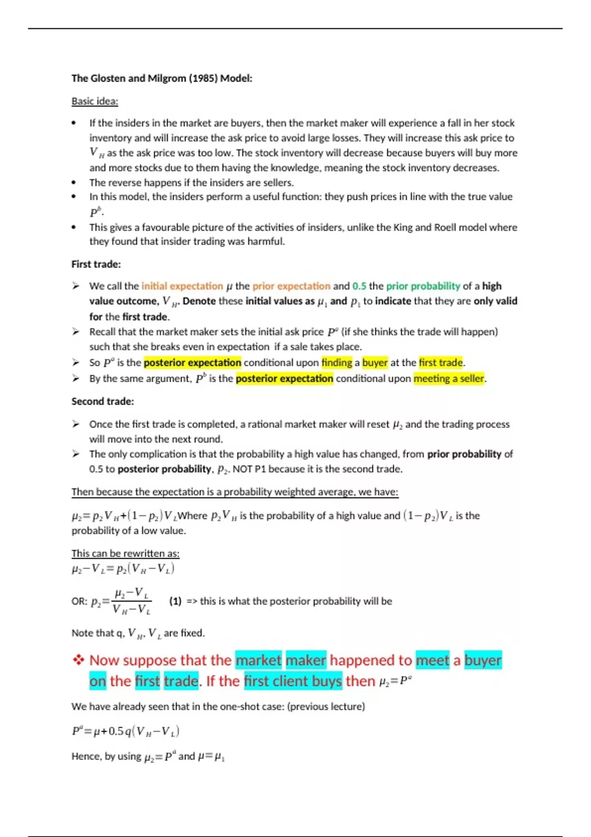 Provides detailed notes and explanations of the Glosten and Milgrom model.