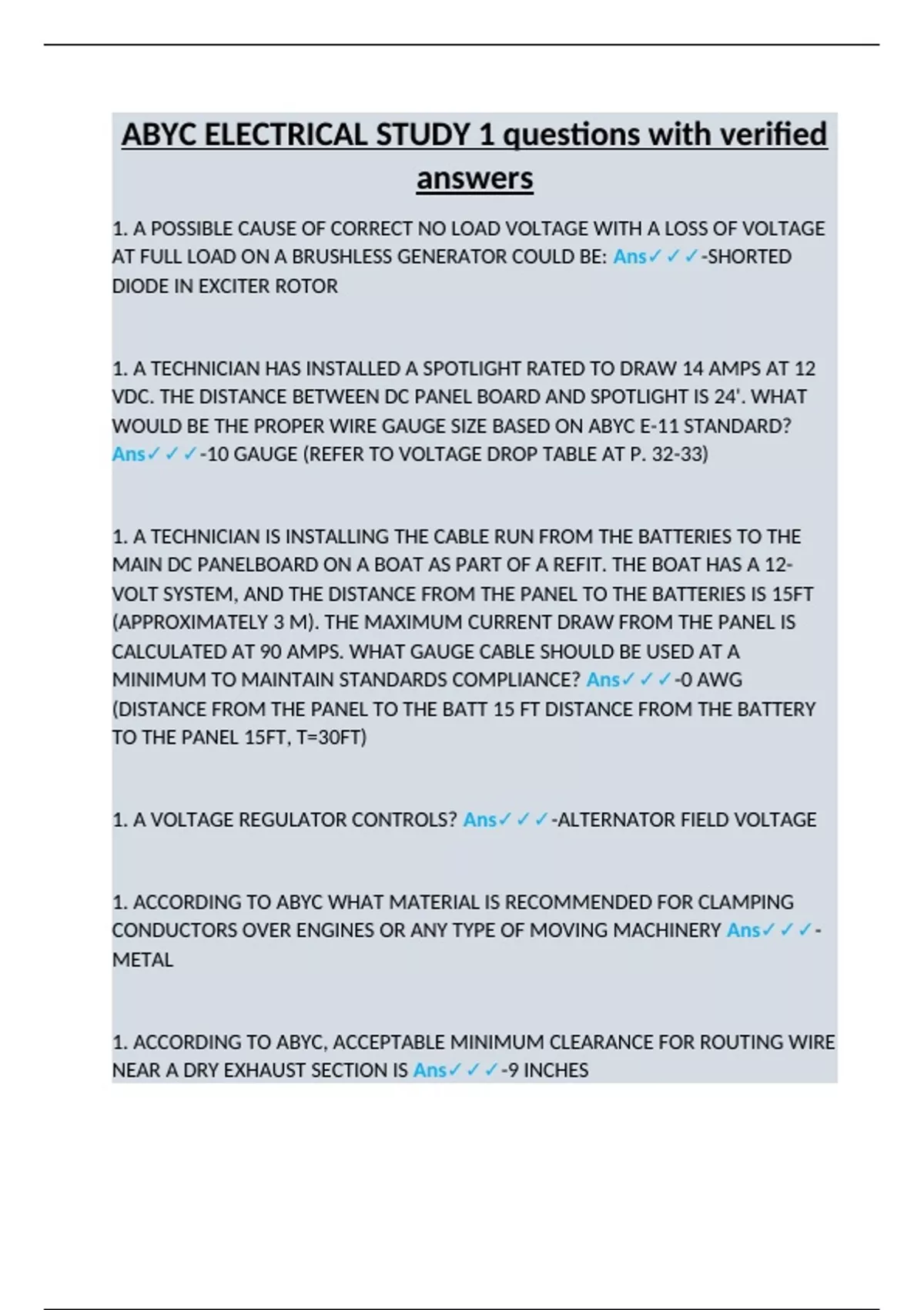 ABYC ELECTRICAL STUDY 1 questions with verified