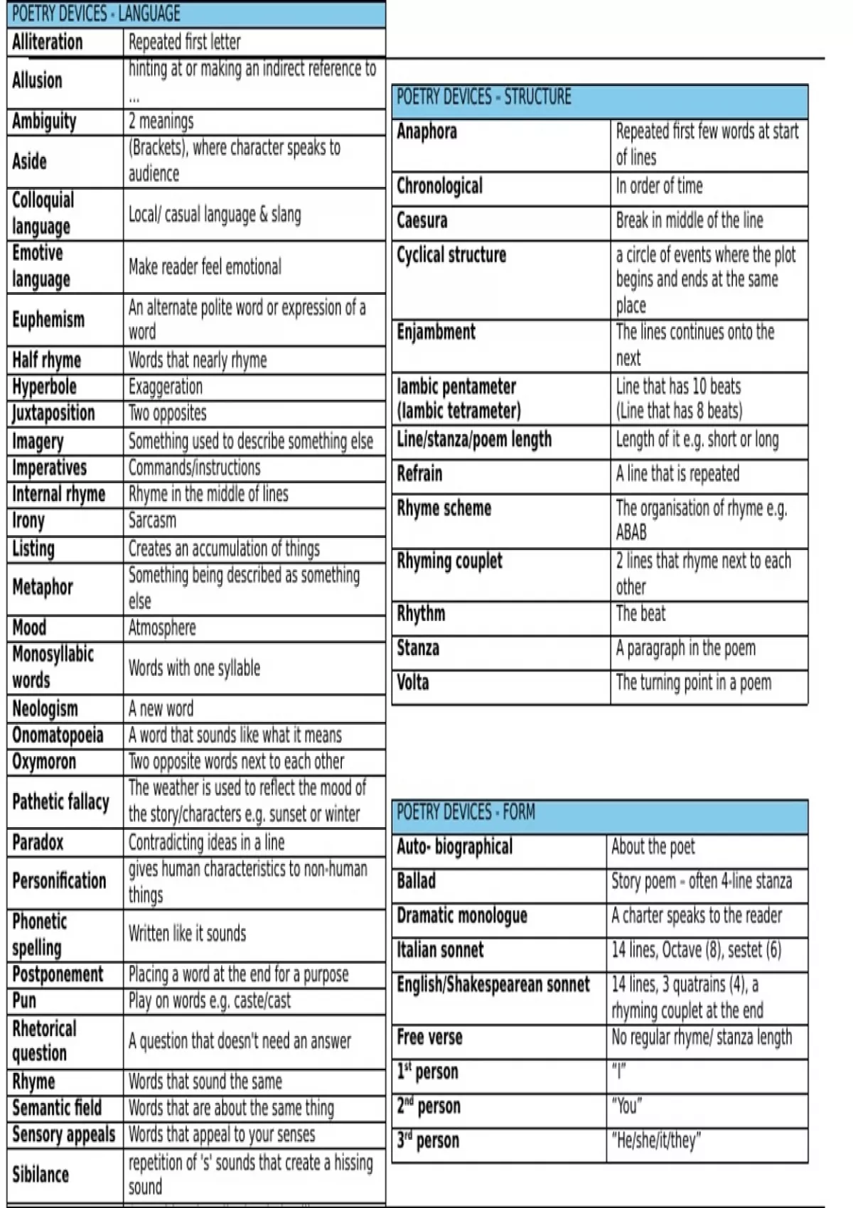 This is contains an overview of all the key literary techniques used in poetry to enhance meaning, structure, and emotion. Common devices include imagery, metaphors, personification, rhyme, symbolism, etc. The sheet serves as a quick reference guide for analysing and understanding the various tools poets use to convey their messages.