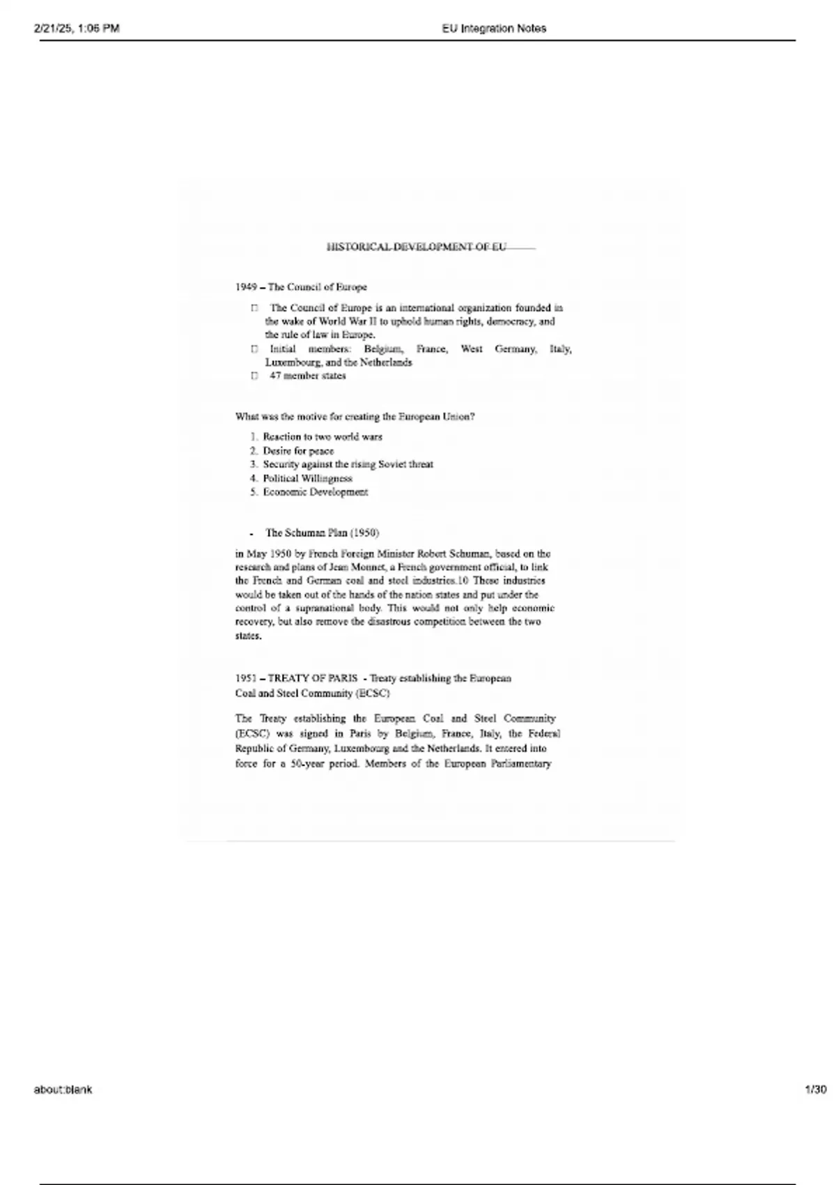 The document titled "EU Integration Notes - EU Law" provides a detailed historical and institutional overview of the European Union's development, making it a valuable resource for students studying EU law and integration. It begins with the post-World War II context, highlighting key milestones like the Schuman Plan (1950), the Treaty of Paris (1951), and the Rome Treaties (1957), which established the European Economic Community (EEC) and EURATOM. The notes trace the EU's evolution through significant treaties such as the Maastricht Treaty (1992), which created the EU, and the Lisbon Treaty (2007), which strengthened EU institutions. The document also covers the EU's widening (enlargement) and deepening (integration) processes, including the accession of new member states and the development of policies like the Schengen Agreement and the single currency. Key legal principles such as direct effect and supremacy of EU law are explained through landmark cases like Costa v ENELand Van Gend en Loos. Additionally, the document outlines the roles and appointment processes of EU institutions like the European Commission and the Council of Ministers, providing a comprehensive understanding of the EU's legal and political framework. This content is likely part of a law or political science course, offering students a thorough grounding in EU history, law, and institutional dynamics.