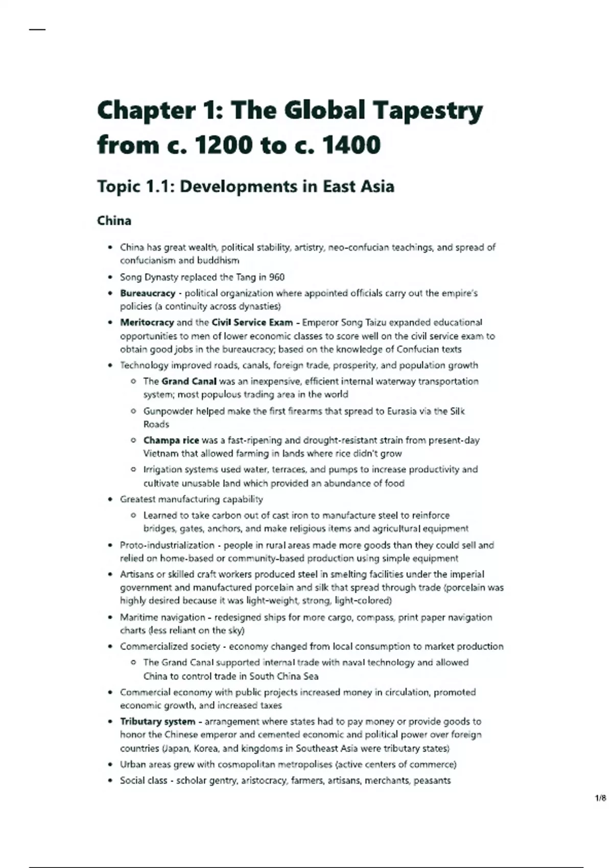 Topic 1.1: Developments in East Asia China China has great wealth, political stability, artistry, neo-confucian teachings, and spread of confucianism and buddhism Song Dynasty replaced the Tang in 960 Bureaucracy - political organization where appointed officials carry out the empire’s policies (a continuity across dynasties) Meritocracy and the Civil Service Exam - Emperor Song Taizu expanded educational opportunities to men of lower economic classes to score well on the civil service exam to obtain good jobs in the bureaucracy; based on the knowledge of Confucian texts Technology improved roads, canals, foreign trade, prosperity, and population growth The Grand Canal was an inexpensive, efficient internal waterway transportation system; most populous trading area in the world Gunpowder helped make the first firearms that spread to Eurasia via the Silk Roads Champa rice was a fast-ripening and drought-resistant strain from present-day Vietnam that allowed farming in lands where rice didn’t grow Irrigation systems used water, terraces, and pumps to increase productivity and cultivate unusable land which provided an abundance of food Greatest manufacturing capability Learned to take carbon out of cast iron to manufacture steel to reinforce bridges, gates, anchors, and make religious items and agricultural equipment Proto-industrialization - people in rural areas made more goods than they could sell and relied on home-based or community-based production using simple equipment Artisans or skilled craft workers produced steel in smelting facilities under the imperial government and manufactured porcelain and silk that spread through trade (porcelain was highly desired because it was light-weight, strong, light-colored) Maritime navigation - redesigned ships for more cargo, compass, print paper navigation charts (less reliant on the sky) Commercialized society - economy changed from local consumption to market production The Grand Canal supported internal trade with naval technology and allowed China to control trade in South China Sea Commercial economy with public projects increased money in circulation, promoted economic growth, and increased taxes Tributary system - arrangement where states had to pay money or provide goods to honor the Chinese emperor and cemented economic and political power over foreign countries (Japan, Korea, and kingdoms in Southeast Asia were tributary states) Urban areas grew with cosmopolitan metropolises (active centers of commerce) Social class - scholar gentry, aristocracy, farmers, artisans, merchants, peasants Low status reflected Confucian respect for hard work and creative value Role of women - respect for women but they still defered to men (patriarchy) Foot binding - girls had their feet wrapped to signify social status; restricted participation in the public sphere in aristocratic families Paper and printing - first culture to use woodblock printing; expanded availability of books (Confucian scholars were major producers of literature) and placed emphasis on creating well-rounded scholar-bureaucrats Buddhism came to China via Silk Roads from India (monk Xuanzang helped build popularity); introduced Buddhism in China by relating beliefs to Daoist principles; 3 forms of Buddhism Theravada Buddhism focused on personal spiritual growth, Mahayana Buddhism focused on spiritual growth for all beings, and Tibetan Buddhism focused on chanting Four Noble Truths - personal suffering alleviated by eliminating cravings or desires and following Buddhist precepts Eight-Fold Path - the precepts that can lead to enlightenment or nirvana (right speech, livelihood, effort, and mindfulness) Chan/Zen Buddhism - syncretic Daoist and Buddhist faith that emphasized direct experience and meditations as opposed to formal learning based on studying scripture Filial piety - duty of family members to subordinate desires to the male head of the family and the ruler; emphasized respect for one’s elders to maintain Song rule Neo-Confucianism - syncretic system; combined rational thought with more abstract ideas of Daoism and Buddhism; ethics over God and nature Japan, Korea, and Vietnam Japan, Korea, and Vietnam had to maintain distinctive cultures or assimilate Chinese practices Japan - Buddhism, Confucianism, and Shinto religion; woodblock printing; emulated Chinese traditions; feudalism and aristocrats (daimyo) Serfs were born into economic dependency while samurai were born into roles as protectors; bushido stressed frugality, loyalty, martial arts, and honor unto death; the emperor had little power and suffered regional rivalries Korea - tributary relationship with China and emulated politics and culture; adopted Confucian and Buddhist beliefs; centralized government; aristocracy were more powerful and prevented Chinese reforms Vietnam - traded with and learned from China, but rebelled against Chinese influence; women had greater independence and preferred nuclear families; villages operated independently; merit-based bureaucracy; rejected foot binding and polygyny