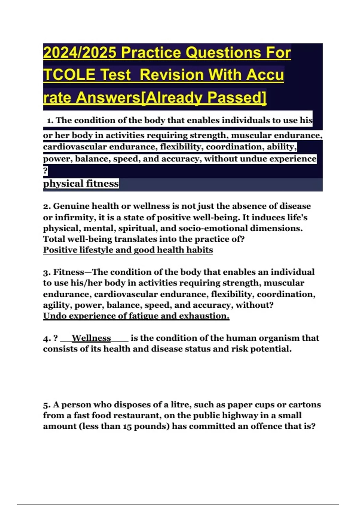 2024/2025 Practice Questions For TCOLE Test Revision With Accurate Answers[Already Passed] 1. The condition of the body that enables individuals to use his or her body in activities requiring strength, muscular endurance, cardiovascular endurance, flexibility, coordination, ability, power, balance, speed, and accuracy, without undue experience ? physical fitness 2. Genuine health or wellness is not just the absence of disease or infirmity, it is a state of positive well-being. It induces life's physical, mental, spiritual, and socio-emotional dimensions. Total well-being translates into the practice of? Positive lifestyle and good health habits 3. Fitness—The condition of the body that enables an individual to use his/her body in activities requiring strength, muscular endurance, cardiovascular endurance, flexibility, coordination, agility, power, balance, speed, and accuracy, without? Undo experience of fatigue and exhaustion. 4. ? __Wellness___ is the condition of the human organism that consists of its health and disease status and risk potential. 5. A person who disposes of a litre, such as paper cups or cartons from a fast food restaurant, on the public highway in a small amount (less than 15 pounds) has committed an offence that is? Class C misdemeanour 6. New residents must obtain a driver's license in this State within? ___90______days. 7. When must a person arrested be taken immediately before a magistrate? When a person arrested demands an immediate appearance before a magistrate or When a person is arrested upon a charge of failure to stop in the event of an accident 8. What is the maximum allowable speed on a pub leach? __15____ mph. 9. Children under? ____8 years_______ of age are required to be in safety seats. 10. Which of the following is not a true statement regarding the Powers of Local Authorities? Can erect or maintain a traffic-control device at any location tore the traffic on a State highway to stop or yield before entering or crossing any intersecting highway. 11. Fleeing from a police officer using a motor vehicle is a ?___Third Degree Felony offence. 12. A motorcycle is not required to have stop lamps if it is equipped with a reflector on the rear of the motorcycle. False 13. WhElementselementts of the offences of riding in open beds? that the child riding in the bed of the truck/trailer is under 18 years of age 14. Daylight is defined as? 1/2 before sunrise to 1/2 hour after sunset 15. The department may issue a special restricted Class M license that authorizes the holder to operate only a motorcycle that has not more than a 250 cubic centimetre piston displacement. A person is eligible for a restricted motorcycle license if the person? Is 15 years of age or older but under 18 years of age 16. A driver may cross a fire hose if permitted by? the fireman in charge 17. Which of the following circumstances require that a driver not stop at a railroad grade crossing? All required stops 18. Which of the following is not true? The driver of an authorized emergency vehicle may: proceed past a red or stop signal or stop sign without slowing down 19. No vehicle shall be turned to proceed in the opposite direction upon any curve, or upon the approach to or near the crest of a grade where the vehicle cannot be seen by the oncoming vehicles from either direction within. 500 ft. 20. No vehicle may overtake to the left if such movement causes the vehicle to come within 200 feet of oncoming traffic. True 21. What is the youngest age at which a hardship license may be issued in the State of Texas? 15 years 22. No more than ?____4____ driving lamps may be lighted at any one time while the vehicle is in operation. 23. Under which of the following conditions may a person drive a vehicle over an unprotected fire hose laid down on a street to be used at a fire? Only with the permission of the fire department official in charge. 24. A person who operates a motor vehicle on a public roadway which is not currently registered is guilty of what offence? Operating an unregistered motor vehicle 25. An emergency vehicle may exceed the speed limit even to the extent that it may endanger other persons. True or false? False 26. A buyer's temporary cardboard license is valid for? __60 ___ days. 27. In-transit license plates may be used. When a dealer is moving the vehicle or When road testing 28. A driver may cross a solid yellow stripe to overtake and pass another vehicle proceeding in the same direction when? A driver may not cross a solid yellow line to overtake and pass another vehicle proceeding in the same direction. 29. If a person has a current Texas driver's license but does not display it to a Peace Officer upon demand he is guilty of what offence? Fail to display driverlicense300. An officer may issue a notice to appear for a Class Cmisdemeanour in the Transportation Cod.? True 31. A flashing red light is treated as a? a stop sign 32. Under which of the following circumstances is a vehicle permitted to drive to the left of the roadway? To avoid a collision 33. Which of the following is not true regarding passing another vehicle on the highway? While making a pass, a vehicle is permitted to exceed the maximum posted speed limit to comply with the rule which states that a pass must be completed by allowing 200 feet for vehicles approaching from the opposite direction. 34. Which of the following conditions does not justify operating a motor vehicle on an improved shoulder of the roadway? Under normal conditions, the driver wishes to use the improved shoulder as a marked lane of traffic. 35. Which of the following is true? Traffic laws apply to persons riding bicycles except those provisions of the Transportation Code that by their nature cannot apply. 36. On a two-way roadway, no vehicle shall be driven on the left side of the roadway, between ?___100______ feet of an intersection, bridge, or tunnel in an incorporated city. 37. Which of the following vehicles does not have a burden t