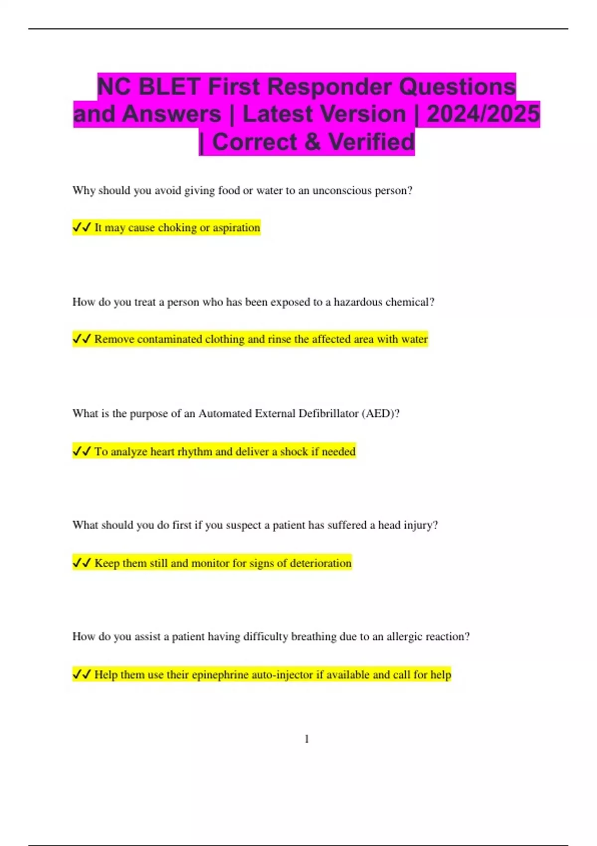 NC BLET First Responder Questions and Answers | Latest Version | 2024/2025 | Correct & Verified Why should you avoid giving food or water to an unconscious person? It may cause choking or aspiration How do you treat a person who has been exposed to a hazardous chemical? Remove contaminated clothing and rinse the affected area with water What is the purpose of an Automated External Defibrillator (AED)? To analyze heart rhythm and deliver a shock if needed What should you do first if you suspect a patient has suffered a head injury? Keep them still and monitor for signs of deterioration How do you assist a patient having difficulty breathing due to an allergic reaction? Help them use their epinephrine auto-injector if available and call for help 2 Why is it important to assess the scene before approaching a patient? To ensure your safety and prevent additional injuries How do you determine if CPR is needed? Check for unresponsiveness and the absence of normal breathing What should you do if a person collapses in front of you but has a pulse and is gasping? Begin rescue breathing and monitor closely Why should you avoid moving a patient with a possible spinal injury? To prevent worsening damage to the spine What should you do if you suspect someone has overdosed on opioids? Call for help and administer naloxone if available How can you recognize heat exhaustion? Heavy sweating, dizziness, and nausea 3 What should you do for a patient who is shivering and has cold, pale skin? Move them to a warm environment and cover them with blankets What is the first step when assessing an unconscious patient? Check for responsiveness and breathing Why is it important to control severe bleeding immediately? To prevent shock and maintain circulation What should you do if a patient is unresponsive but