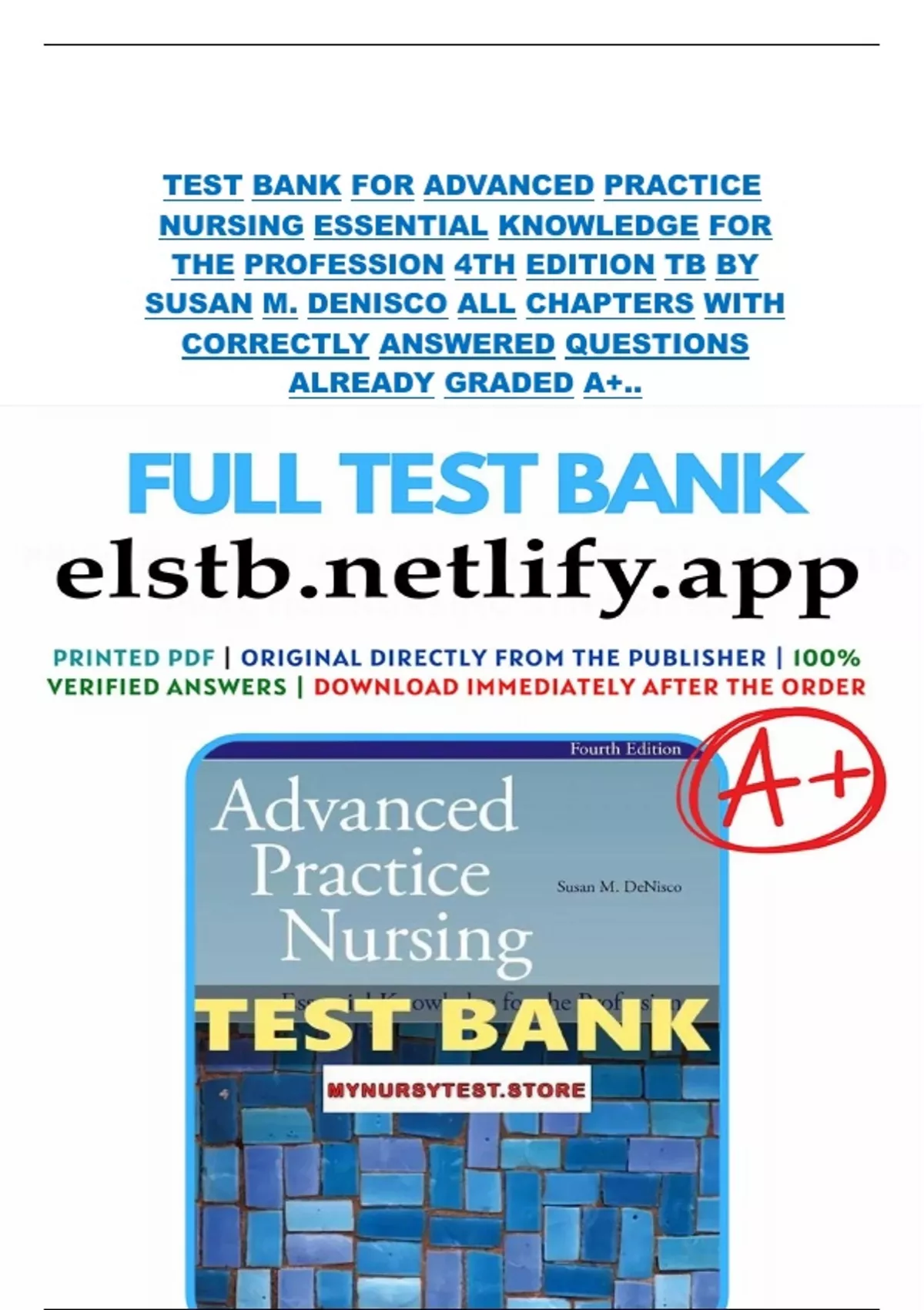 TEST BANK FOR ADVANCED PRACTICE NURSING ESSENTIAL KNOWLEDGE FOR THE PROFESSION 4TH EDITION TB BY SUSAN M. DENISCO ALL CHAPTERS WITH CORRECTLY ANSWERED QUESTIONS ALREADY GRADED A+.. ISBN....9781284176124