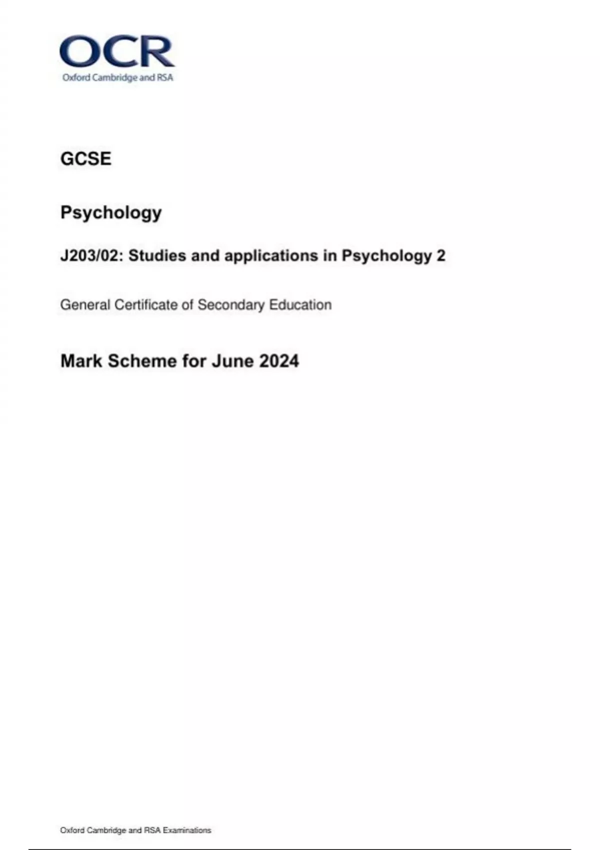 OCR GCSE Psychology J203/02: Studies and applications in Psychology 2 General Certificate of Secondary Education Mark Scheme for June 2024