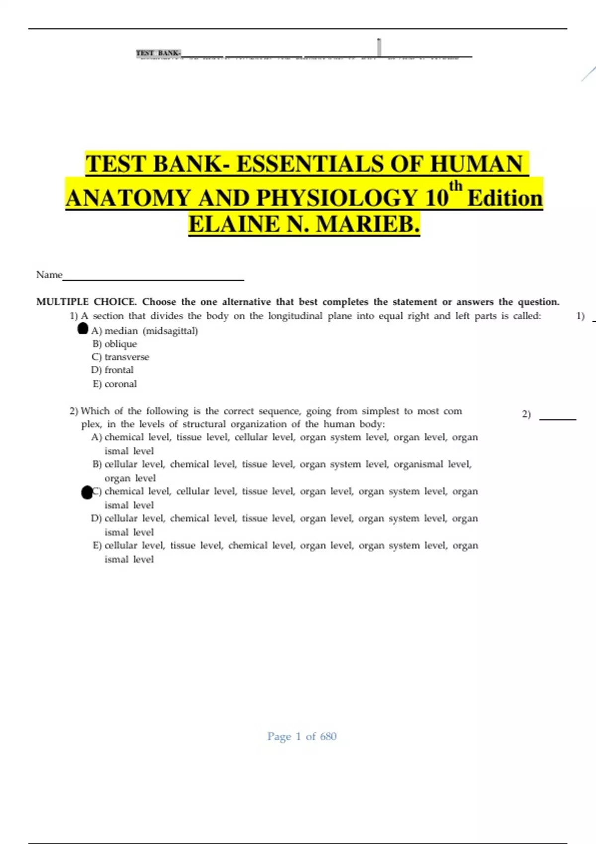TEST BANK HUMAN ANATOMY AND PHYSIOLOGY 10th Edition by Elaine N. Marieb | Latest Practice Exam 100% Verified Answers | Graded A+