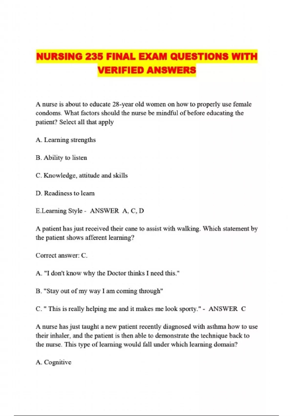 NURSING 235 FINAL EXAM QUESTIONS WITH VERIFIED ANSWERS