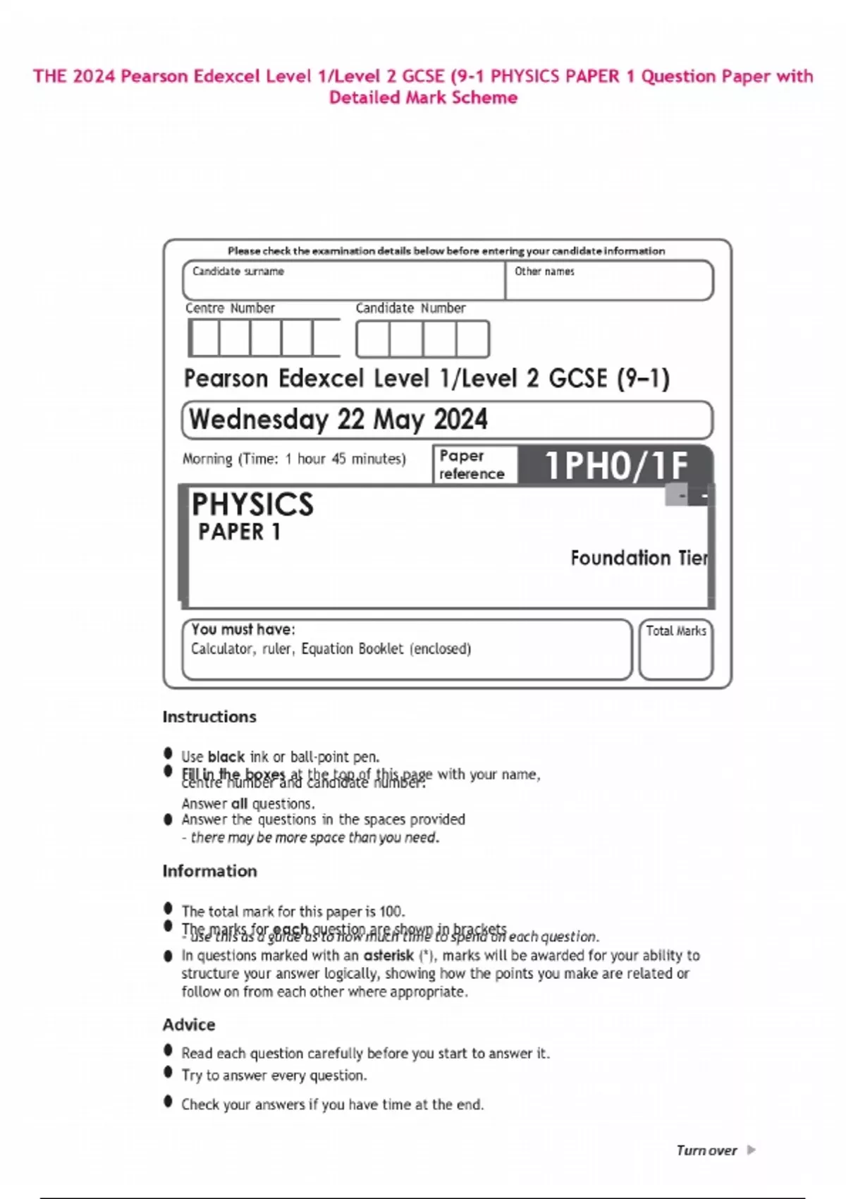 THE 2024 Pearson Edexcel Level 1/Level 2 GCSE (9-1 PHYSICS PAPER 1 Question Paper with Detailed Mark Scheme