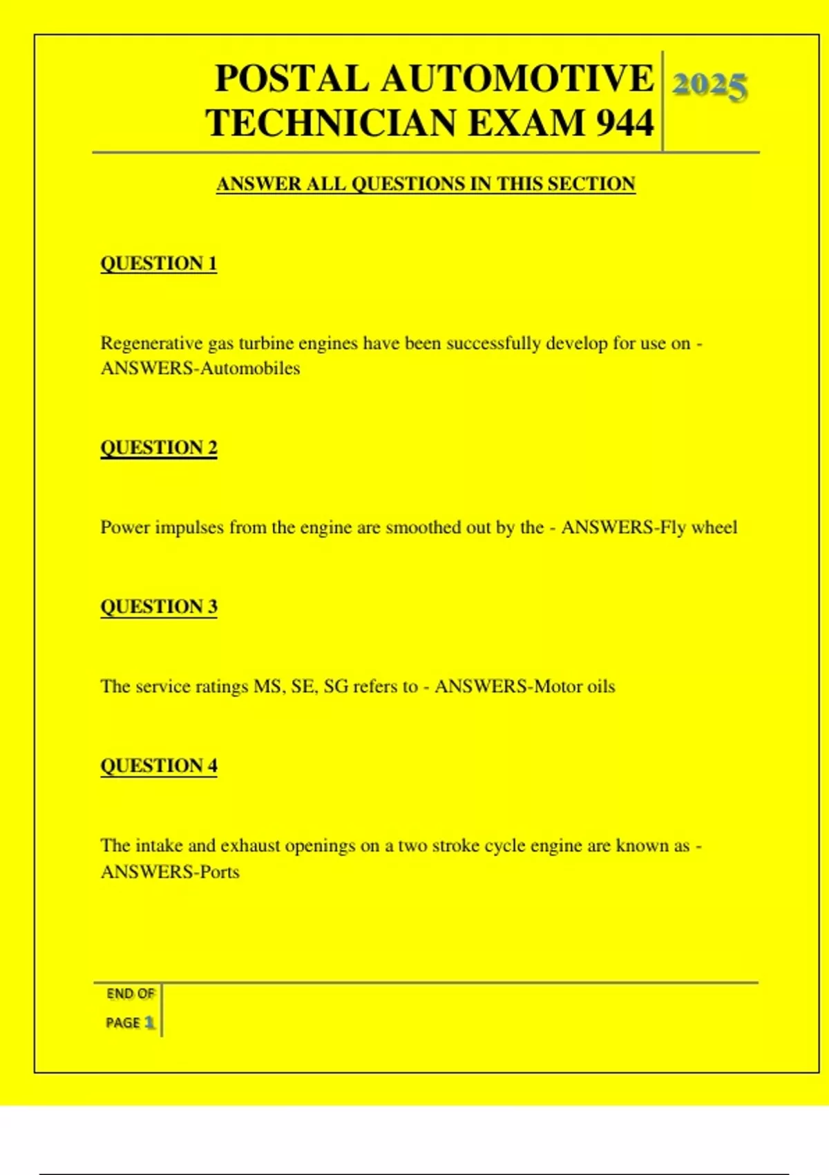 POSTAL AUTOMOTIVE TECHNICIAN EXAM 944 QUESTIONS AND ANSWERS 2025