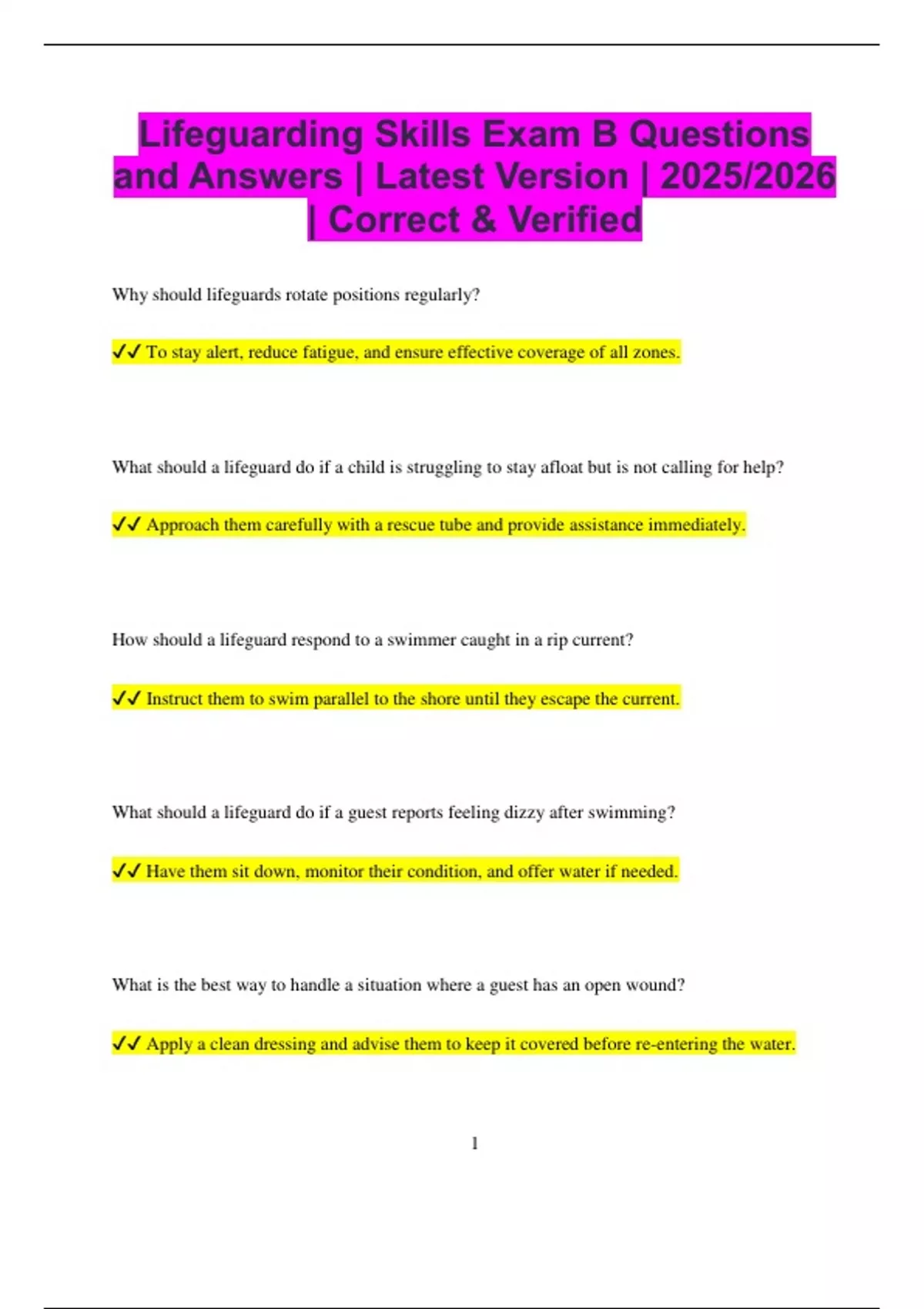 Lifeguarding Skills Exam B Questions and Answers | Latest Version | 2025/2026 | Correct & Verified Why should lifeguards rotate positions regularly? To stay alert, reduce fatigue, and ensure effective coverage of all zones. What should a lifeguard do if a child is struggling to stay afloat but is not calling for help? Approach them carefully with a rescue tube and provide assistance immediately. How should a lifeguard respond to a swimmer caught in a rip current? Instruct them to swim parallel to the shore until they escape the current. What should a lifeguard do if a guest reports feeling dizzy after swimming? Have them sit down, monitor their condition, and offer water if needed. What is the best way to handle a situation where a guest has an open wound? Apply a clean dressing and advise them to keep it covered before re-entering the water. 2 What is the best way to ensure quick response times in an emergency? Regular training, clear communication, and rehearsing emergency action plans. How should a lifeguard assist a panicked swimmer who is actively drowning? Approach with a rescue tube and keep a safe distance while offering assistance. What is the correct way to perform CPR on an infant? Use two fingers for compressions, at a depth of about 1.5 inches, with a 30:2 compression- to-breath ratio. How should a lifeguard respond to a choking victim who becomes unresponsive? Lower them to the ground and begin CPR, checking for the obstructing object between compressions. What should a lifeguard do after an emergency rescue? Document the incident, debrief with the team, and reset equipment for the next emergency. What should a lifeguard do if a guest faints near the poolside? 3 Check for responsiveness, monitor breathing, and call for medical assistance if necessary. What should a lifeguard do if they suspect someone has hypothermia? Move them to a warm area, remove wet clothing, and provide dry blankets. How should a lifeguard handle a guest experiencing a diabetic emergency? Offer them a source of sugar if they are conscious and call for medical assistance. What is the primary duty of a lifeguard?