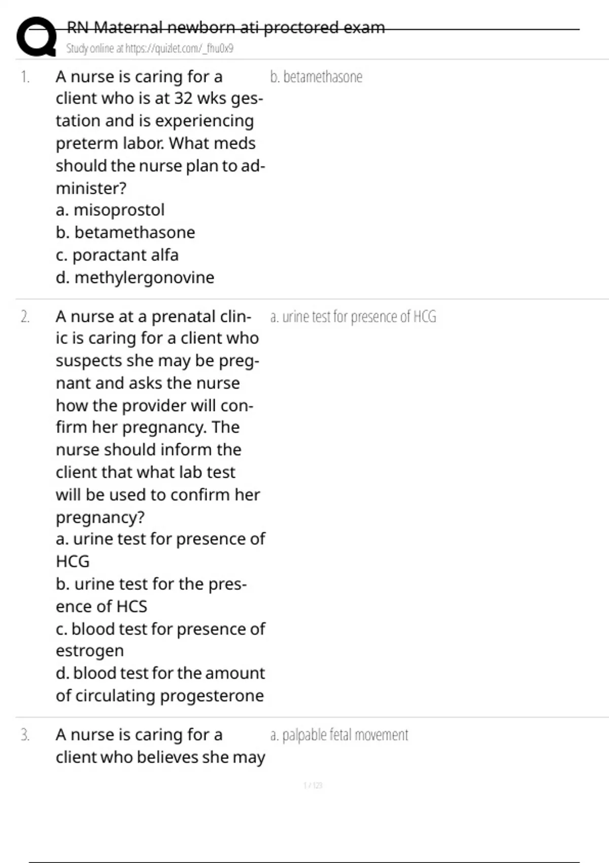 2. A nurse at a prenatal clin- a. urine test for presence of HCG