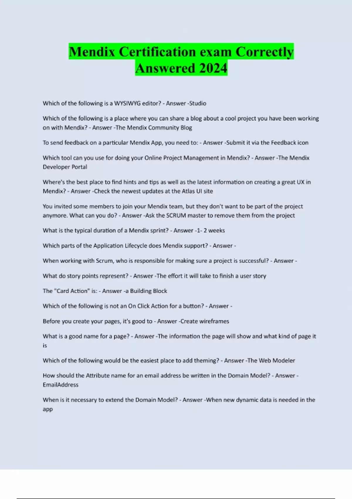 Mendix Certification exam Correctly Answered 2024 Which of the following is a WYSIWYG editor? - Answer -Studio Which of the following is a place where you can share a blog about a cool project you have been working on with Mendix? - Answer -The Mendix Community Blog To send feedback on a particular Mendix App, you need to: - Answer -Submit it via the Feedback icon Which tool can you use for doing your Online Project Management in Mendix? - Answer -The Mendix Developer Portal Where's the best place to find hints and tips as well as the latest information on creating a great UX in Mendix? - Answer -Check the newest updates at the Atlas UI site You invited some members to join your Mendix team, but they don't want to be part of the project anymore. What can you do? - Answer -Ask the SCRUM master to remove them from the project What is the typical duration of a Mendix sprint? - Answer -1- 2 weeks Which parts of the Application Lifecycle does Mendix support? - Answer - When working with Scrum, who is responsible for making sure a project is successful? - Answer - What do story points represent? - Answer -The effort it will take to finish a user story The "Card Action" is: - Answer -a Building Block Which of the following is not an On Click Action for a button? - Answer - Before you create your pages, it's good to - Answer -Create wireframes What is a good name for a page? - Answer -The information the page will show and what kind of page it is Which of the following would be the easiest place to add theming? - Answer -The Web Modeler How should the Attribute name for an email address be written in the Domain Model? - Answer - EmailAddress When is it necessary to extend the Domain Model? - Answer -When new dynamic data is needed in the appWhat is the purpose of adding a navigation menu in your app? - Answer -Allow the user to find the pages that they are looking for It is possible to publish your app while it still has errors? - Answer -false What is an object? - Answer -An instance of an entity You want to explain the reason for adding an exclusive split to a microflow. What is the best way to do it? - Answer -Add an annotation connected to the exclusive split The green bullet at the beginning of a microflow shows: - Answer -the starting point of a microflow You want to add a button to your course overview page that will create a new TrainingEvent. What parameter should you pass to the microflow? - Answer -The Course entity Which activity will you need if you use a microflow to schedule a new TrainingEvent. - Answer -Create Object You can use a microflow to create: - Answer -an object Which of the following is true? - Answer -You can only commit when your working copy is up to date