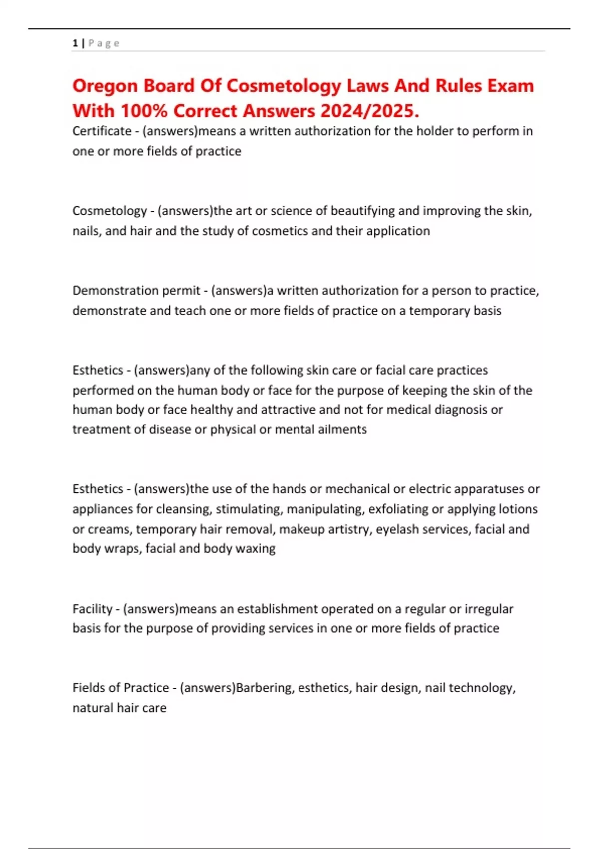 Oregon Board Of Cosmetology Laws And Rules Exam With 100% Correct Answers 2024/2025.