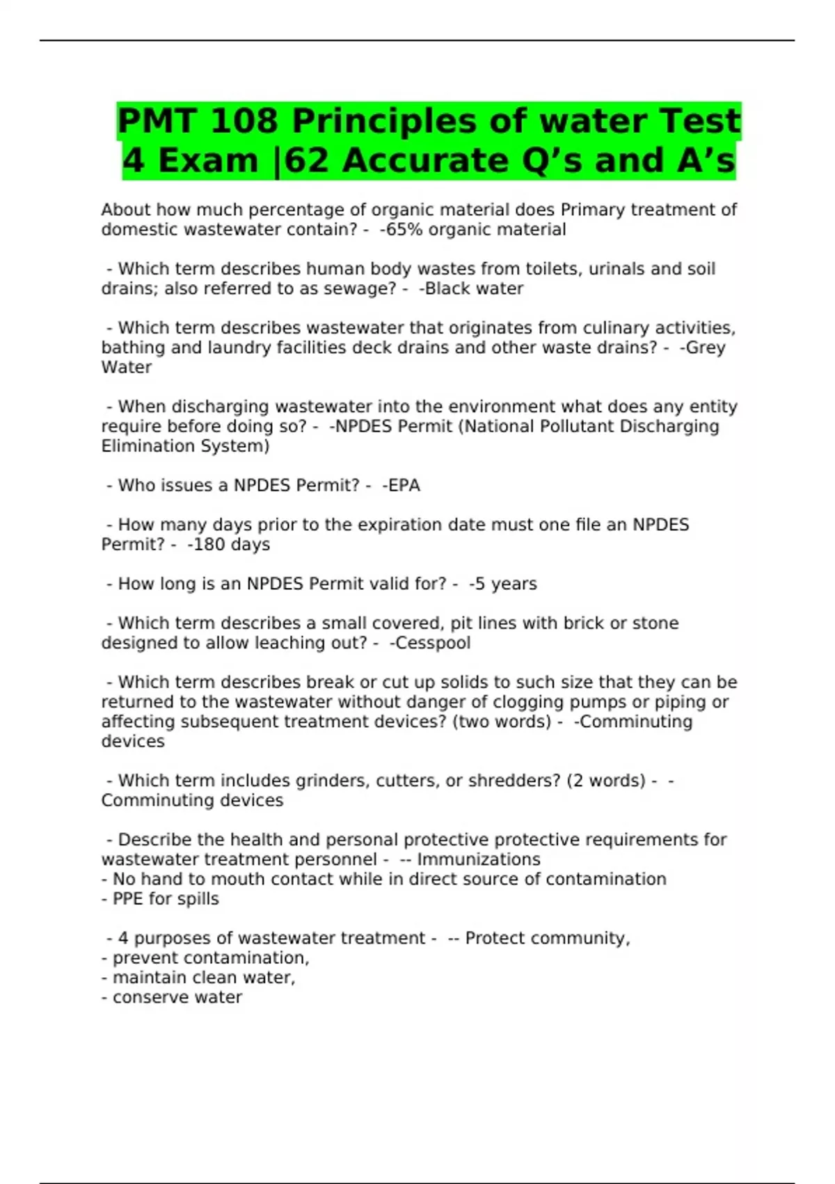 PMT 108 Principles of water Test 4 Exam |62 Accurate Q’s and A’s