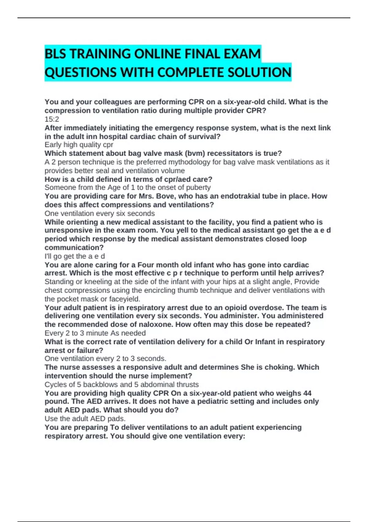 BLS TRAINING ONLINE FINAL EXAM QUESTIONS WITH COMPLETE SOLUTION