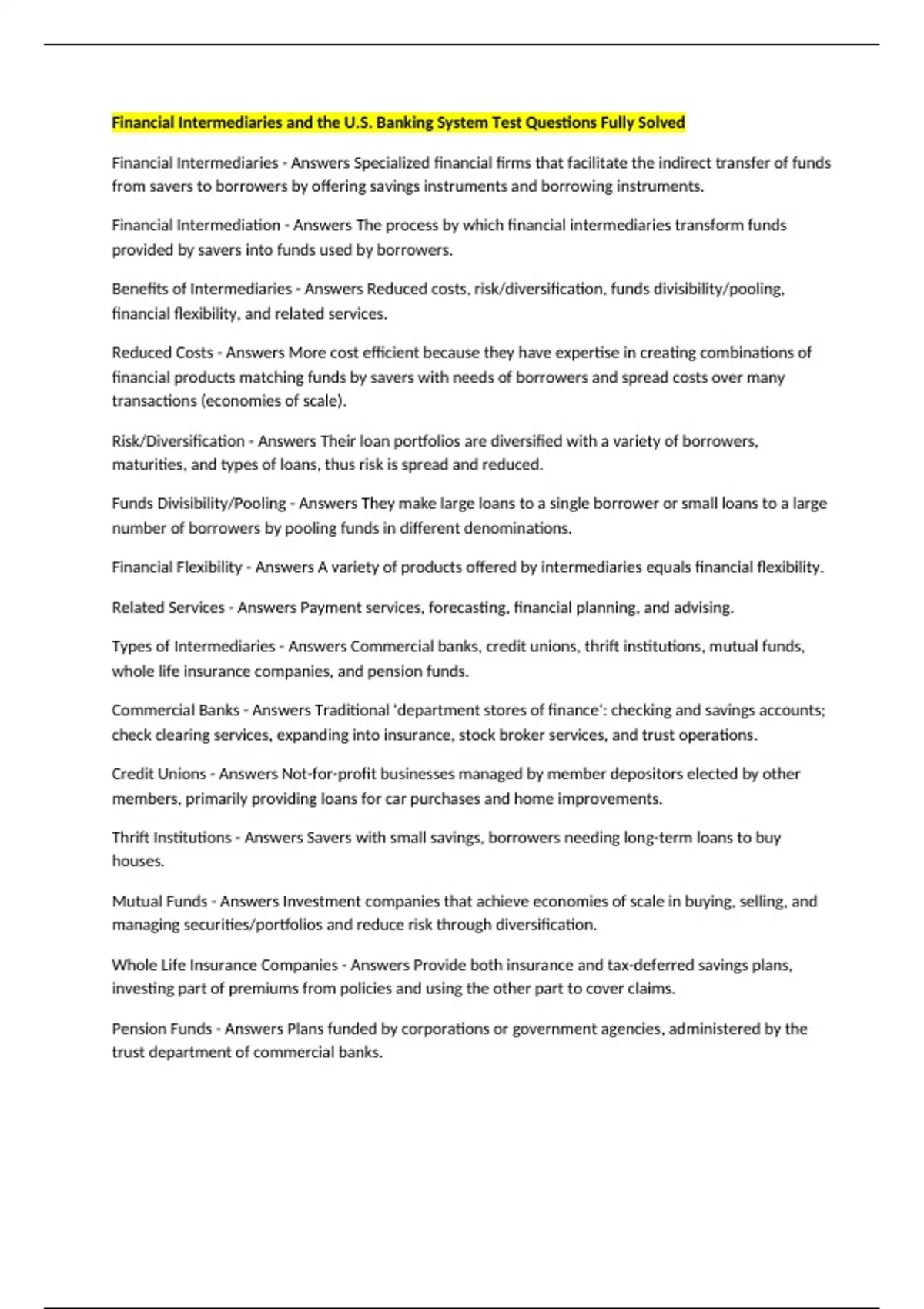 Financial Intermediaries and the U.S. Banking System Test Questions Fully Solved Financial Intermediaries - Answers Specialized financial firms that facilitate the indirect transfer of funds from savers to borrowers by offering savings instruments and borrowing instruments. Financial Intermediation - Answers The process by which financial intermediaries transform funds provided by savers into funds used by borrowers. Benefits of Intermediaries - Answers Reduced costs, risk/diversification, funds divisibility/pooling, financial flexibility, and related services. Reduced Costs - Answers More cost efficient because they have expertise in creating combinations of financial products matching funds by savers with needs of borrowers and spread costs over many transactions (economies of scale). Risk/Diversification - Answers Their loan portfolios are diversified with a variety of borrowers, maturities, and types of loans, thus risk is spread and reduced. Funds Divisibility/Pooling - Answers They make large loans to a single borrower or small loans to a large number of borrowers by pooling funds in different denominations. Financial Flexibility - Answers A variety of products offered by intermediaries equals financial flexibility. Related Services - Answers Payment services, forecasting, financial planning, and advising. Types of Intermediaries - Answers Commercial banks, credit unions, thrift institutions, mutual funds, whole life insurance companies, and pension funds. Commercial Banks - Answers Traditional 'department stores of finance': checking and savings accounts; check clearing services, expanding into insurance, stock broker services, and trust operations. Credit Unions - Answers Not-for-profit businesses managed by member depositors elected by other members, primarily providing loans for car purchases and home improvements. Thrift Institutions - Answers Savers with small savings, borrowers needing long-term loans to buy houses.