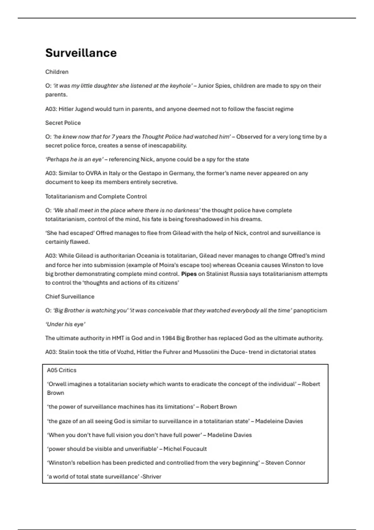 This guide provides thematic sheets comparing 1984 and Handmaid's tale as needed in the exam. It covers A05 critics and A03 context too to expand and develop your points alongside the key textual quotations.