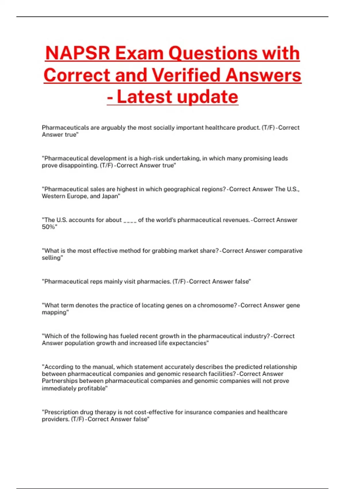 NAPSR Exam Questions with Correct and Verified Answers - Latest update Pharmaceuticals are arguably the most socially important healthcare product. (T/F) - Correct Answer true" "Pharmaceutical development is a high-risk undertaking, in which many promising leads prove disappointing. (T/F) - Correct Answer true" "Pharmaceutical sales are highest in which geographical regions? - Correct Answer The U.S., Western Europe, and Japan" "The U.S. accounts for about ____ of the world's pharmaceutical revenues. - Correct Answer 50%" "What is the most effective method for grabbing market share? - Correct Answer comparative selling" "Pharmaceutical reps mainly visit pharmacies. (T/F) - Correct Answer false" "What term denotes the practice of locating genes on a chromosome? - Correct Answer gene mapping" "Which of the following has fueled recent growth in the pharmaceutical industry? - Correct Answer population growth and increased life expectancies" "According to the manual, which statement accurately describes the predicted relationship between pharmaceutical companies and genomic research facilities? - Correct Answer Partnerships between pharmaceutical companies and genomic companies will not prove immediately profitable" "Prescription drug therapy is not cost-effective for insurance companies and healthcare providers. (T/F) - Correct Answer false" "The high price of healthcare is explained by the high price of medicines. (T/F) - Correct Answer false" "One of the oldest and least effective pharmaceutical marketing techniques is DTC (direct-to-consumer) advertising. (T/F) - Correct Answer false" "What influences the number of districts in a region? - Correct Answer the region's population" "What is an example of the regionalization of healthcare delivery systems? - Correct Answer California and Florida have different prescription reimbursement policies" "The heart of a pharmaceutical sales team is the regional manager. (T/F) - Correct Answer false" "Most DMs did not start as representatives. (T/F) - Correct Answer false" "How many territories are in a typical district? - Correct Answer 8 to 12" "What field is MOST concerned with drug effects due to slight genetic differences? - Correct Answer pharmacogenomics" "Which entity or entities fund/s the National Institutes of Health (NIH)? - Correct Answer US federal government" "With respect to your manual, what does IDN stand for? - Correct Answer integrated delivery network" "What is SS an abbreviation for? - Correct Answer semis" "What term is used to denote drugs that are non-biological (i.e. chemical) in nature? - Correct Answer small molecule" "When referring to medication dosage, which medical abbreviation denotes "hour"? - Correct Answer H" "Which of the following terms denotes the study of drugs' beneficial and toxic effects on living cells, tissues, and organisms? - Correct Answer pharmacology" "What are specialized cells and tissues that work together to perform a specific body function for a common purpose? - Correct Answer organs" "What is the mechanism of action? - Correct Answer the method by which a medication produces its therapeutic effects" "What is plasma? - Correct Answer Fluid portion of blood" "What is anaphylaxis? - Correct Answer An extreme sensitivity and reaction to a foreign substance, including medications" "Which of the following is NOT a way in which CNS agents are used? - Correct Answer ALL - analgesics - anesthetics - anti-convulsants" "How do cholinergic agonists work? - Correct Answer by mimicking the actions of acetylcholine" "Which of the following types of therapeutic agents is used to promote blood clot formation? - Correct Answer fibrinolytics" "Which of the following is NOT a type of gastrointestinal agent? - Correct Answer prolactin inhibitors" "What is one of the main functions of a tocolytic agent? - Correct Answer to suppress labor" "Which of these conditions is NOT treated with antiandrogens? - Correct Answer dyspepsia" "which types of patients are MOST likely to receive immune globulins? - Correct Answer patients with weakened immune systems" "What is iron's primary function in the body? - Correct Answer to carry oxygen" "Which of the following is NOT a type of anti-infectant? - Correct Answer antimetabolites" "What is one difference between entry-level and experienced resumes? - Correct Answer entry-level resumes are more likely to begin with the education section than the experience section" "Which statement about targeted cover letters is true? - Correct Answer targeted cover letters are always tailored to specific companies" "It usually only takes 1-2 calls to a physician before he or she commits to prescribing your product. (T/F) - Correct Answer false" "The pharmacist may dispense a product other than what the physician prescribed. (T/F) - Correct Answer true" "According to ch. 12 of the manual, which of the following would classify as "payers"? - Correct Answer employers" "According to the manual, what defines "ethical pharmaceutical companies"? - Correct Answer researching and developing novel drugs" "One of the most disappointing results of the pharmaceutical industry's continued investment in R & D is the few new drugs being approved and in development. (T/F) - Correct Answer false" "Thanks to modern medicines, how long are people newly diagnosed with HIV expected to live? - Correct Answer another 50 years" "How much has the average American lifespan increased since 1890? - Correct Answer almost 30 years" "What is a treatment group? - Correct Answer a group of patients assigned to receive a specific treatment" "What is the main difference between a blinded and double-blinded study? - Correct Answer in a double blinded study, neither the study staff nor the study participants know which subjects are in the experimental group and which are in the control" "What does "asymptomatic" mean? - Correct Answer not exhibiting signs or symptoms" "Which term denotes the study of bodily functions (as opposed to 