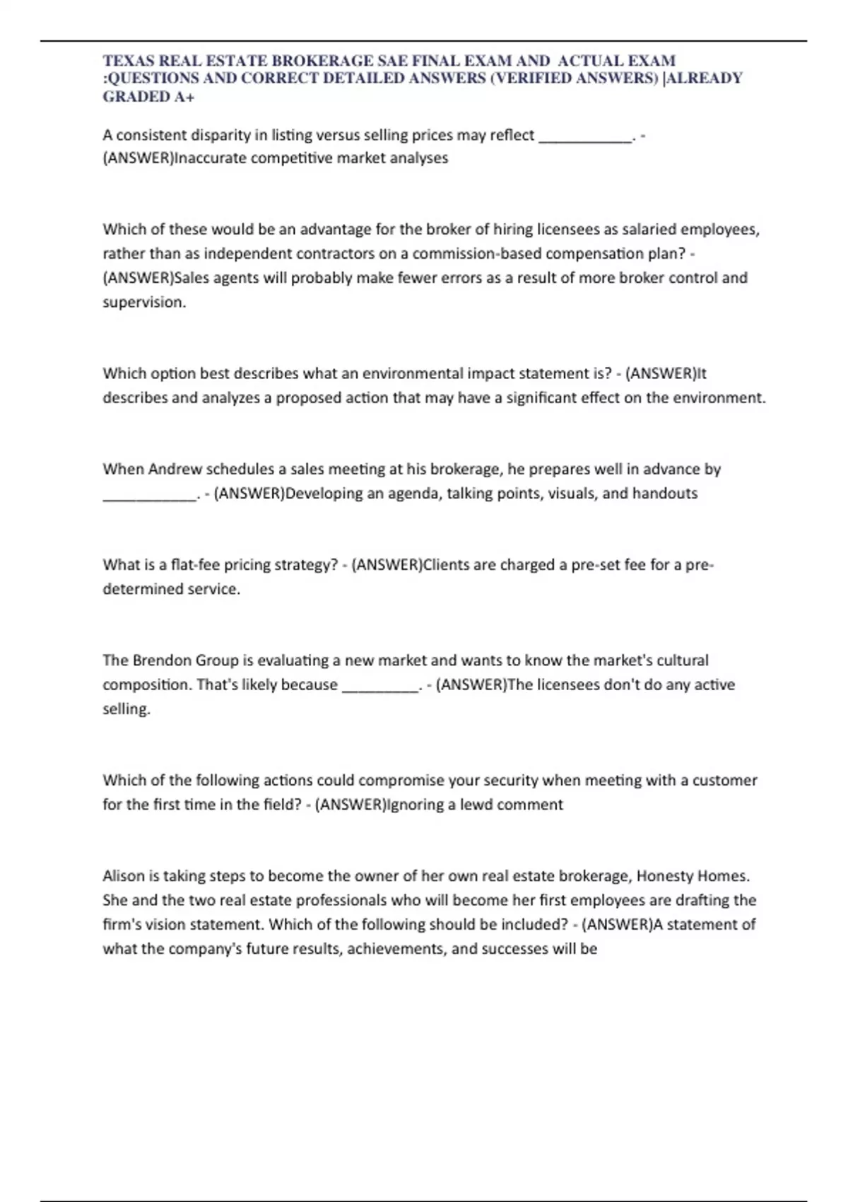 TEXAS REAL ESTATE BROKERAGE SAE FINAL EXAM AND ACTUAL EXAM :QUESTIONS AND CORRECT DETAILED ANSWERS (VERIFIED ANSWERS) |ALREADY GRADED A