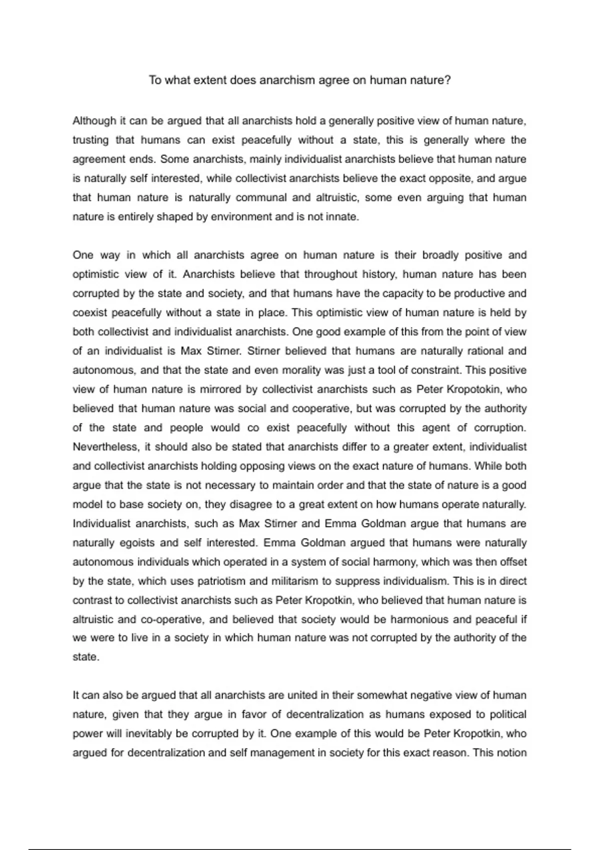 A full marks essay on how much anarchist thinkers agree on human nature. It compares different anarchist thinkers and and includes an essay plan summarizing the main points.