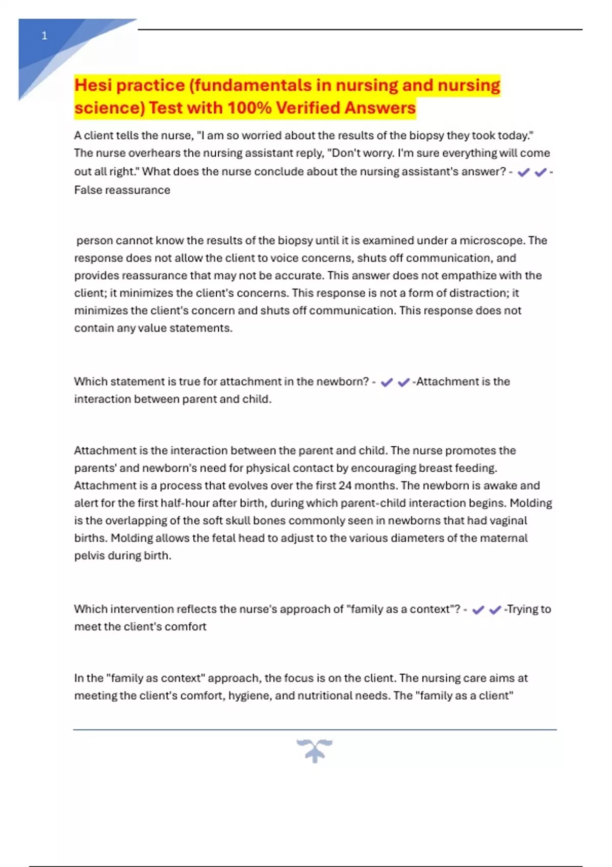 A client tells the nurse, "I am so worried about the results of the biopsy they took today." The nurse overhears the nursing assistant reply, "Don't worry. I'm sure everything will come out all right." What does the nurse conclude about the nursing assistant's answer? - - False reassurance person cannot know the results of the biopsy until it is examined under a microscope. The response does not allow the client to voice concerns, shuts off communication, and provides reassurance that may not be accurate. This answer does not empathize with the client; it minimizes the client's concerns. This response is not a form of distraction; it minimizes the client's concern and shuts off communication. This response does not contain any value statements. Which statement is true for attachment in the newborn? - -Attachment is the interaction betw