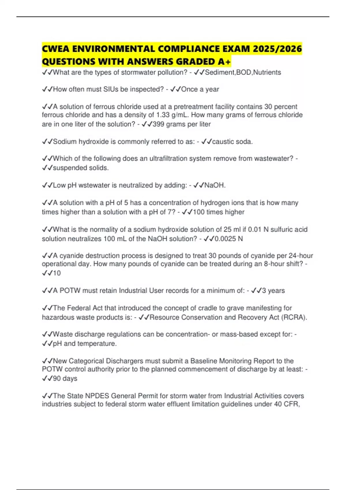 CWEA ENVIRONMENTAL COMPLIANCE EXAM 2025/2026 QUESTIONS WITH ANSWERS GRADED A+
