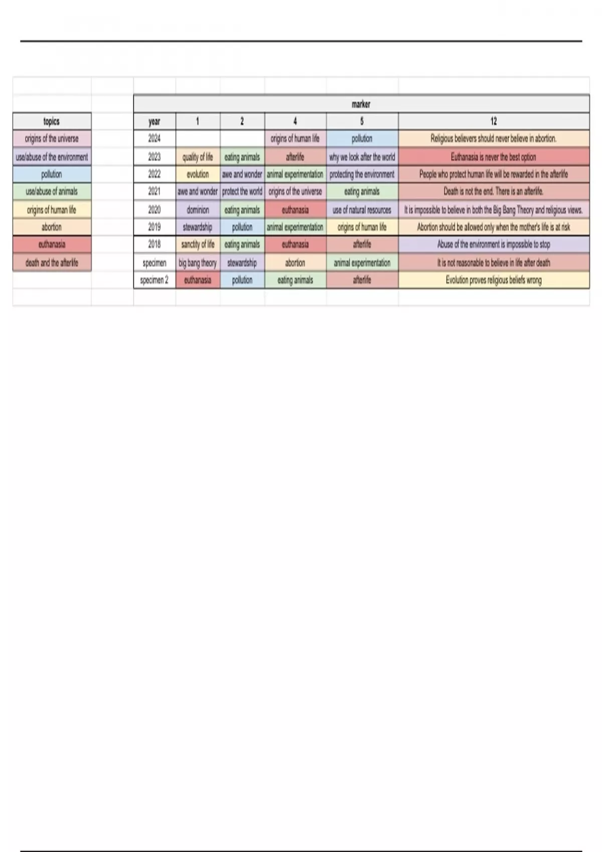 Get ready for your GCSE RS exams with our easy-to-use spreadsheet of AQA past paper questions! This resource is color-coded by theme, making it simple to see which topics come up most often and which ones haven't been tested yet. Including questions up to 2024, this tool helped me predict 6 out of 8 RS 12 markers in my exam. Use it to focus your study efforts and increase your chances of success. This is for Theme B religion and life.