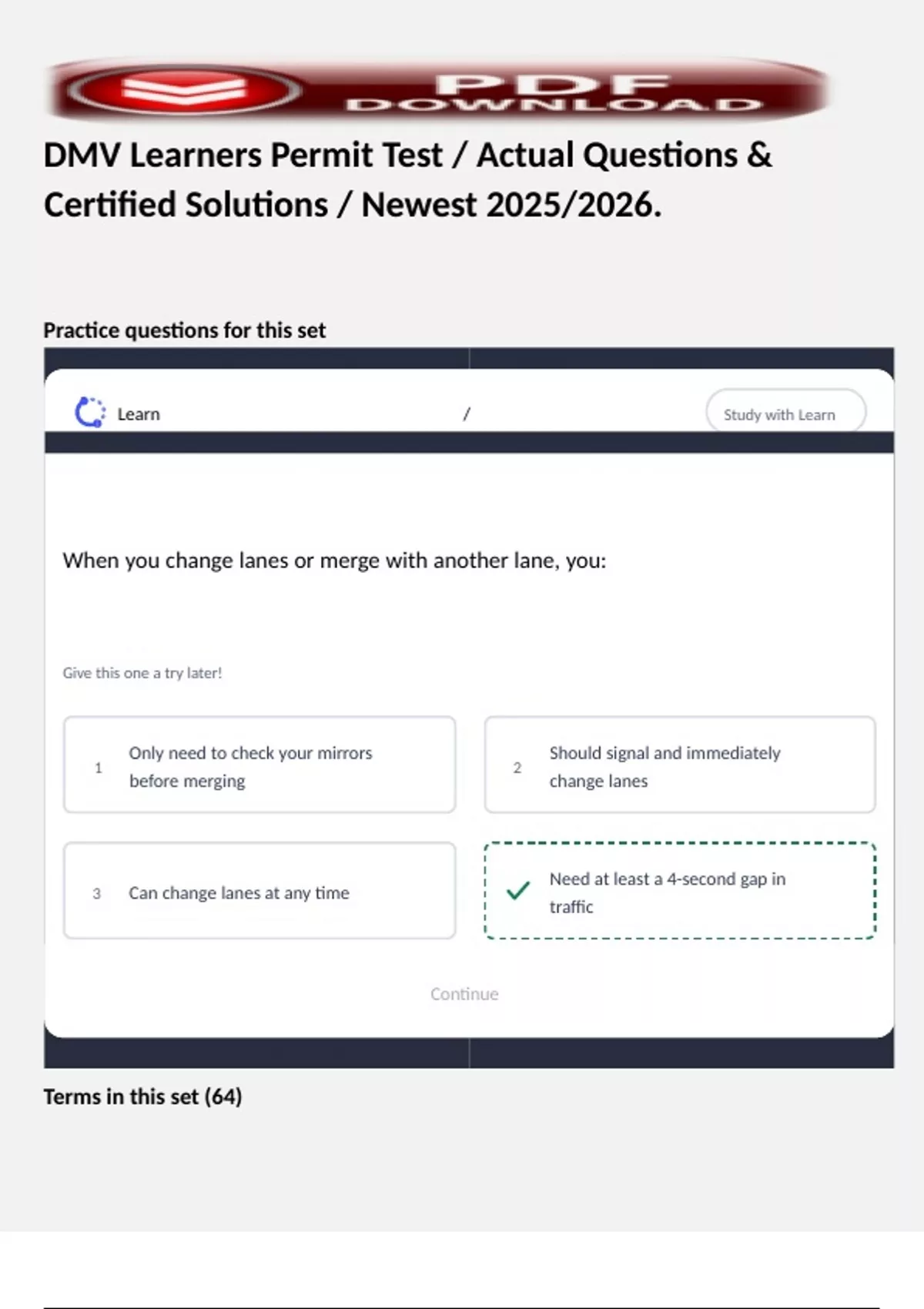 DMV Learners Permit Test / Actual Questions & Certified Solutions / Newest 2025/2026.