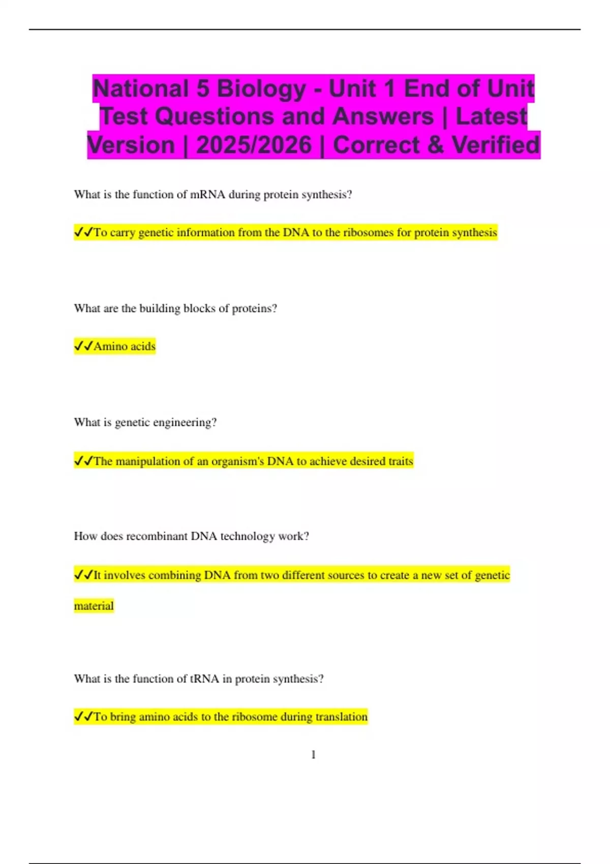 National 5 Biology - Unit 1 End of Unit Test Questions and Answers | Latest Version | 2025/2026 | Correct & Verified What is the function of mRNA during protein synthesis? To carry genetic information from the DNA to the ribosomes for protein synthesis What are the building blocks of proteins? Amino acids What is genetic engineering? The manipulation of an organism's DNA to achieve desired traits How does recombinant DNA technology work? It involves combining DNA from two different sources to create a new set of genetic material What is the function of tRNA in protein synthesis? To bring amino acids to the ribosome during translation 2 What is the process by which cells divide to form two identical cells? Mitosis What is the role of the enzyme helicase in DNA replication? To unwind the DNA double helix What is the main function of the cell membrane? To control the movement of substances in and out of the cell What structure in plant cells contains chlorophyll? Chloroplasts What is the role of ribosomes in the cell? To synthesize proteins Which organelle is responsible for producing ATP in animal cells? Mitochondria 3 What is the main difference between prokaryotic and eukaryotic cells? Prokaryotic cells do not have a nucleus, whereas eukaryotic cells do What is the function of the vacuole in plant cells? To store water and maintain turgidity What process occurs in the mitochondria of the cell? Aerobic respiration What is the main role of the nucleus in a cell? To control the activities of the cell and store genetic material (DNA) What is a gene? A section of DNA that codes for a specific protein How does active transport differ from passive transport? Active transport requires energy, while passive transport does not