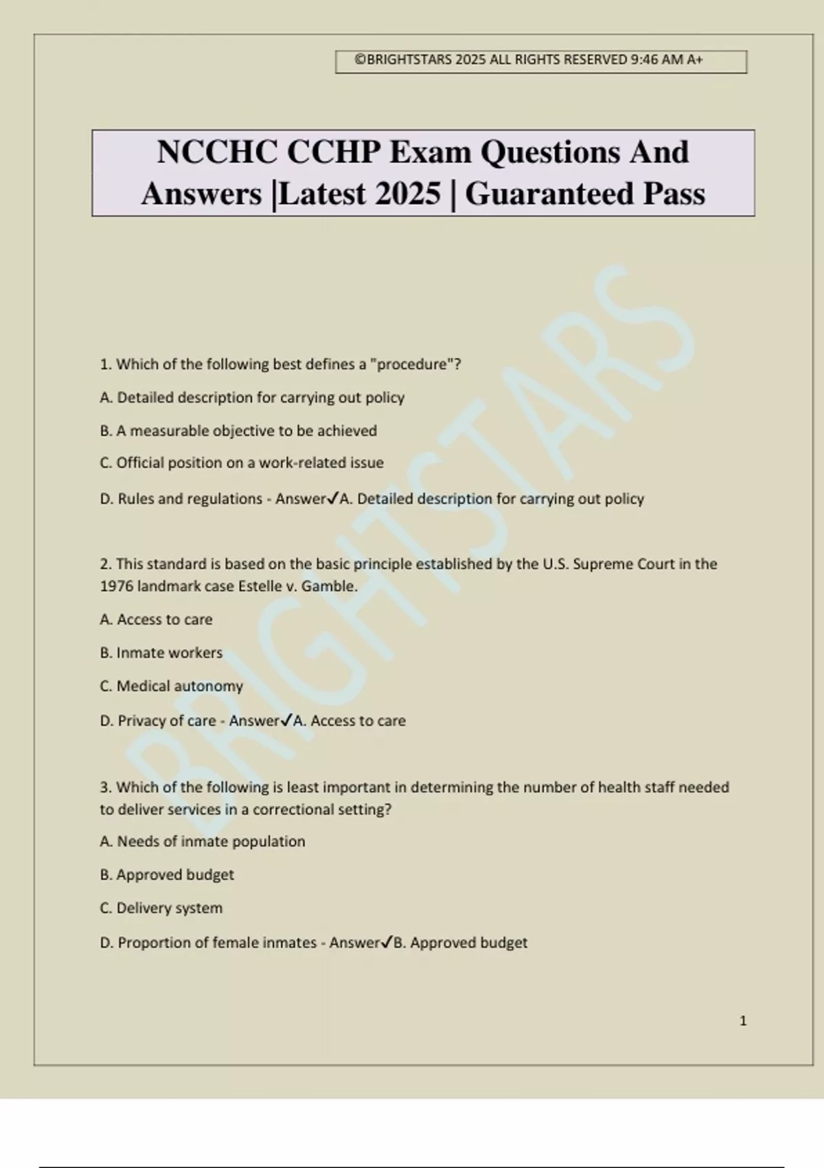 ©BRIGHTSTARS 2025 ALL RIGHTS RESERVED 9:46 AM A+ 1 NCCHC CCHP Exam Questions And Answers |Latest 2025 | Guaranteed Pass 1. Which of the following best defines a "procedure"? A. Detailed description for carrying out policy B. A measurable objective to be achieved C. Official position on a work-related issue D. Rules and regulations - AnswerA. Detailed description for carrying out policy 2. This standard is based on the basic principle established by the U.S. Supreme Court in the 1976 landmark case Estelle v. Gamble. A. Access to care B. Inmate workers C. Medical autonomy D. Privacy of care - AnswerA. Access to care 3. Which of the following is least important in determining the number of health staff needed to deliver services in a correctional setting? A. Needs of inmate population B. Approved budget C. Delivery system D. Proportion of female inmates - AnswerB. Approved budget ©BRIGHTSTARS 2025 ALL RIGHTS RESERVED 9:46 AM A+ 2 4. The following individuals, in the absence of any written authorization from the adult inmate- patient, may have access to that patient's medical records: A. Inmate's attorney B. Private physician C. U.S. congressman D. None of the above - AnswerD. None of the above 5. Which statement below best describes universal precautions? A. Adhering to advisories published by the Centers for Disease Control and Prevention for disposing of infectious waste B. Taking protective steps with patients known to have infectious diseases so as to minimize exposure of workers and others to contagious disease C. Assuming all patients present a potential for transmission of infectious disease and adopting the same protective techniques with every patient D. Using masks, gowns and gloves for protection from infectious disease - AnswerC. Assuming all patients present a potential for transmission of infectious disease and adopting the same protective techniques with every patient What is the Access to Care standard? - AnswerInmates have access to care for their serious medical, dental, and mental health needs. Define "access to care" (three criteria) - Answer1. In a timely manner, a patient is seen by a qualified health care professional, 2. is rendered a clinical judgment, 3. and receives care that is ordered What is the basic principle established by the U.S. Supreme Court landmark case in 1976 Estelle v. Gamble? - AnswerInmates