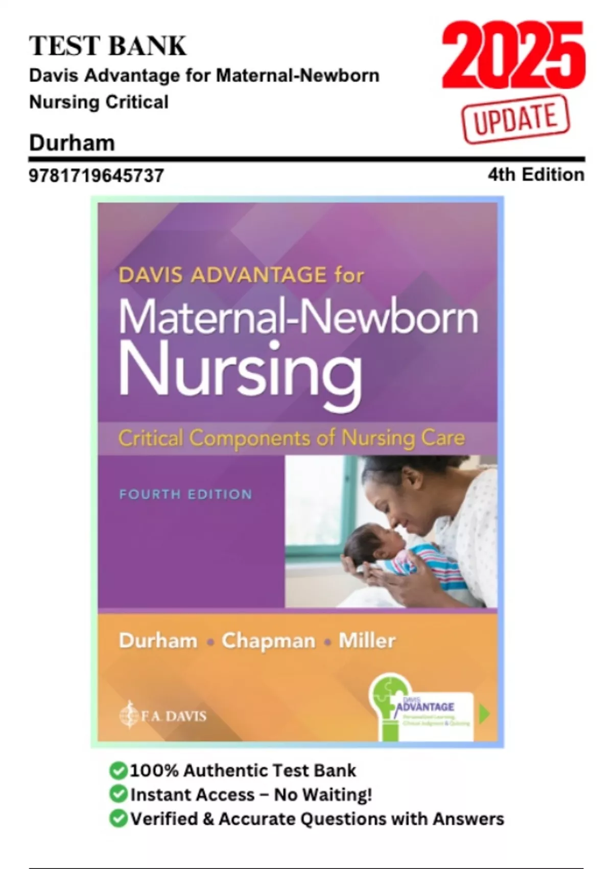 Test Bank for Davis Advantage for Maternal-Newborn Nursing Critical Components of Nursing Care, 4th Edition by Durham, 9781719645737, Covering Chapters 1–19 | Includes Rationales