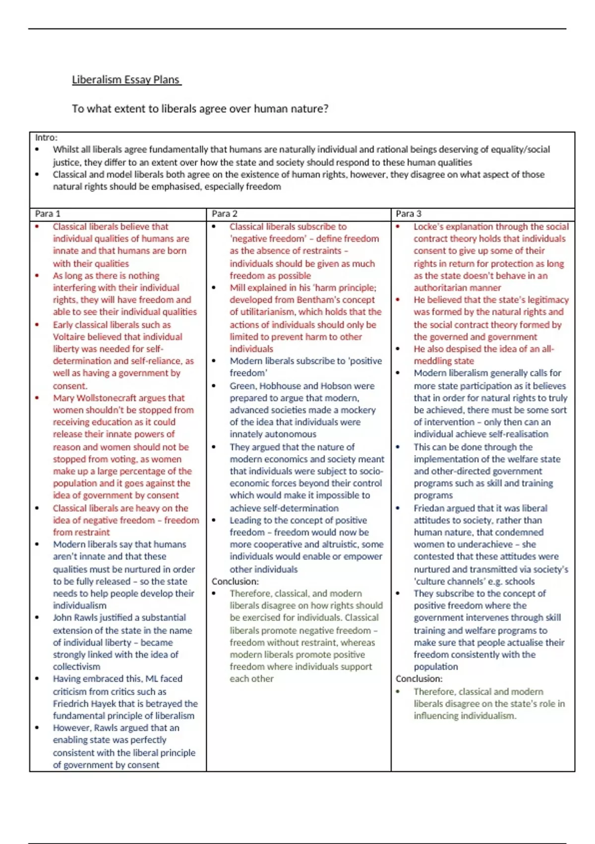 Pearson Edexcel A level Government and Politics Liberalism Essay Plans
