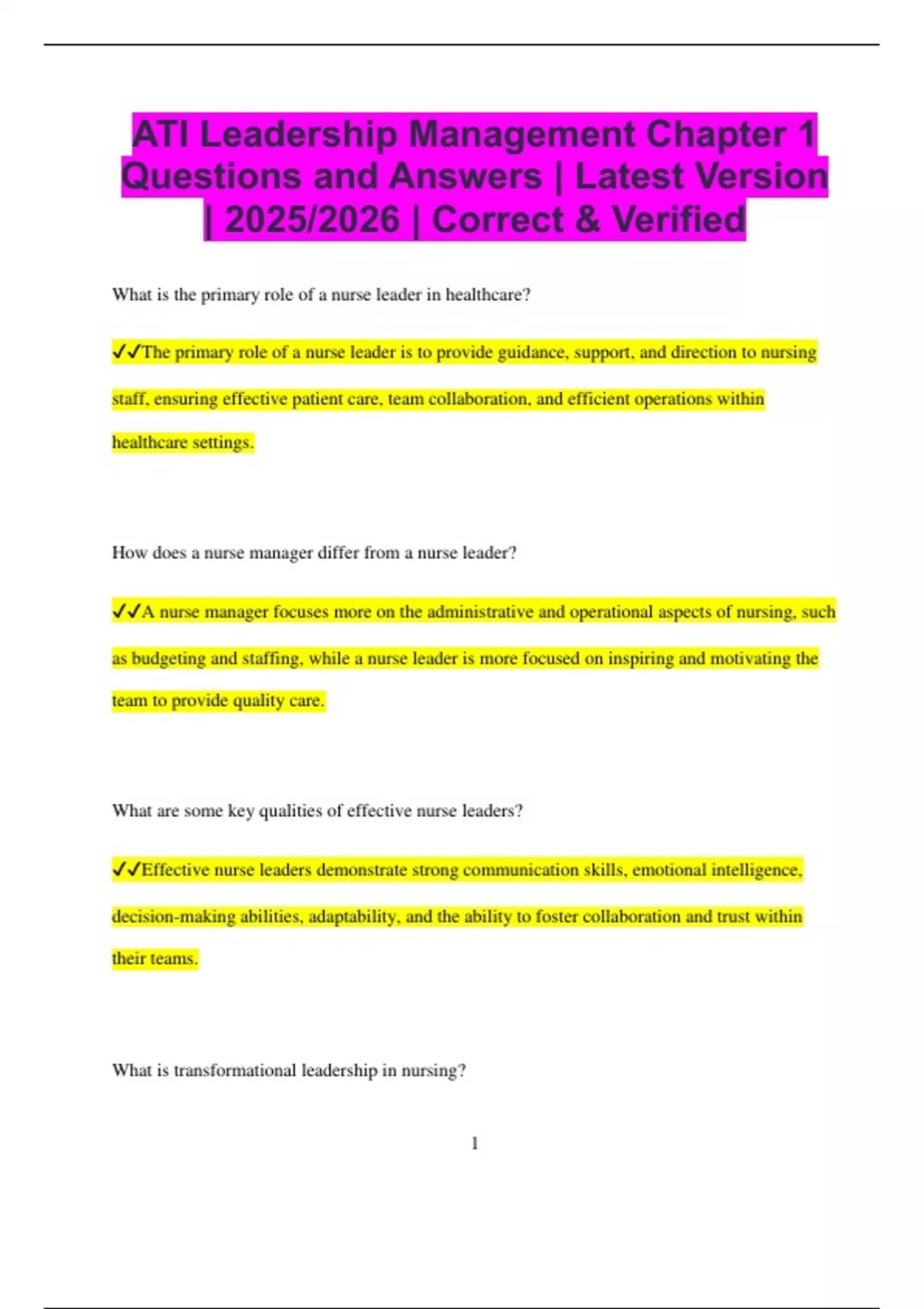 ATI Leadership Management Chapter 1 Questions and Answers | Latest Version | 2025/2026 | Correct & Verified What is the primary role of a nurse leader in healthcare? The primary role of a nurse leader is to provide guidance, support, and direction to nursing staff, ensuring effective patient care, team collaboration, and efficient operations within healthcare settings. How does a nurse manager differ from a nurse leader? A nurse manager focuses more on the administrative and operational aspects of nursing, such as budgeting and staffing, while a nurse leader is more focused on inspiring and motivating the team to provide quality care. What are some key qualities of effective nurse leaders? Effective nurse leaders demonstrate strong communication skills, emotional intelligence, decision-making abilities, adaptability, and the ability to foster collaboration and trust within their teams. What is transformational leadership in nursing? 2 Transformational leadership in nursing is a style where leaders inspire and motivate their team to achieve higher levels of performance and personal growth through vision, encouragement, and support. Why is delegation important in nursing leadership? Delegation is important in nursing leadership because it allows leaders to efficiently manage tasks, empower team members, and ensure that the right tasks are completed by the right individuals with appropriate skill levels. What does it mean to have a "shared governance" model in nursing? A shared governance model in nursing involves nurses at all levels participating in decision- making processes, empowering them to have a voice in shaping policies and practices within their organization. What is the significance of emotional intelligence for nurse leaders? Emotional intelligence is crucial for nurse leaders because it helps them manage their own emotions, understand and respond to the emotions of others, and build strong, trusting relationships with their teams. How can nurse leaders promote a positive work environment? 3 Nurse leaders can promote a positive work environment by encouraging open communication, recognizing staff achievements, providing ongoing support, and fostering a culture of respect and collaboration. What is the role of a nurse leader in conflict resolution? The role of a nurse leader in conflict resolution is to mediate disputes, listen to all parties involved, and help find mutually beneficial solutions while maintaining a focus on patient care and team cohesion. How do nurse leaders demonstrate accountability? Nurse leaders demonstrate accountability by taking responsibility for their actions and decisions, ensuring that their team members are held to the same standards, and consistently following through on commitments. Why is strategic planning important for nurse managers? Strategic planning is important for nurse managers because it helps guide the direction of the nursing department, sets clear goals, allocates resources effectively, and ensures alignment with the overall mission and vision of the healthcare organization. What is the difference between leadership and management in nursing? 4 Leadership in nursing involves influencing and guiding others toward achieving goals, while management focuses on organizing, planning, and overseeing the operational aspects of nursing services. How can a nurse leader influence organizational change? A nurse leader can influence organizational change by setting a clear vision, communicating effectively with staff, addressing concerns, and leading by example to implement new practices or policies that improve patient care and operational efficiency. What is the importance of mentorship in nursing leadership? Mentorship in nursing leadership is important because it helps develop future leaders, provides guidance and support to new nurses, and promotes the sharing of knowledge and experiences to improve practice standards. How do nurse leaders handle the challenges of
