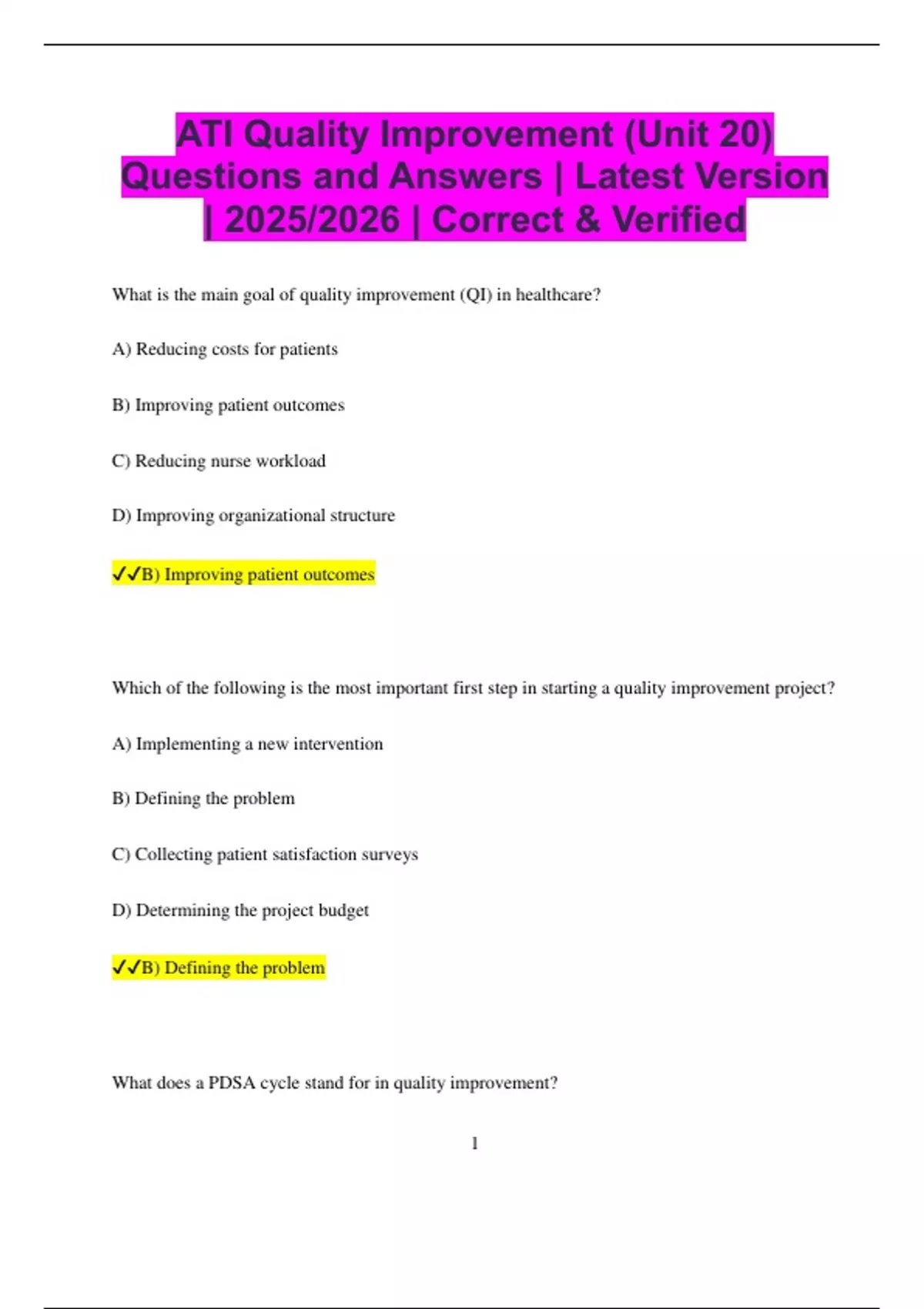 ATI Quality Improvement (Unit 20) Questions and Answers | Latest Version | 2025/2026 | Correct & Verified What is the main goal of quality improvement (QI) in healthcare? A) Reducing costs for patients B) Improving patient outcomes C) Reducing nurse workload D) Improving organizational structure B) Improving patient outcomes Which of the following is the most important first step in starting a quality improvement project? A) Implementing a new intervention B) Defining the problem C) Collecting patient satisfaction surveys D) Determining the project budget B) Defining the problem What does a PDSA cycle stand for in quality improvement? 2 A) Plan, Do, Study, Act B) Prevent, Detect, Solve, Analyze C) Plan, Design, Study, Act D) Plan, Do, Solve, Analyze A) Plan, Do, Study, Act Which of the following is an example of a process measure in quality improvement? A) Patient satisfaction scores B) Blood pressure measurements taken every hour C) Number of infections during a hospital stay D) Time taken to administer pain medication B) Blood pressure measurements taken every hour How can root cause analysis contribute to quality improvement in healthcare? A) By identifying the most cost-effective treatment options B) By identifying the underlying causes of errors or problems C) By creating a new set of guidelines for staff D) By reducing staffing levels in the department 3 B) By identifying the underlying causes of errors or problems What is the role of data in quality improvement initiatives? A) To provide proof of compliance with regulations B) To inform decision-making and identify areas for improvement C) To increase the complexity of the process D) To allow for faster patient discharges B) To inform decision-making and identify areas for improvement Which of the following is a key component of a continuous quality improvement (CQI) model? A) One-time projects to improve processes B) Frequent analysis of patient feedback C) Ongoing process evaluation and refinement D) Reducing the number of hospital beds C) Ongoing process evaluation and refinement What is the most effective way to ensure that a quality improvement project is successful? A) Providing financial incentives to staff 4 B) Engaging all team members and stakeholders in the process C) Changing processes without consulting staff D) Focusing solely on clinical outcomes B) Engaging all team members and stakeholders in the process What does the term "benchmarking" refer to in quality improvement? A) Measuring patient outcomes against industry standards B) Increasing the number of procedures performed C) Identifying the most efficient hospital in the area
