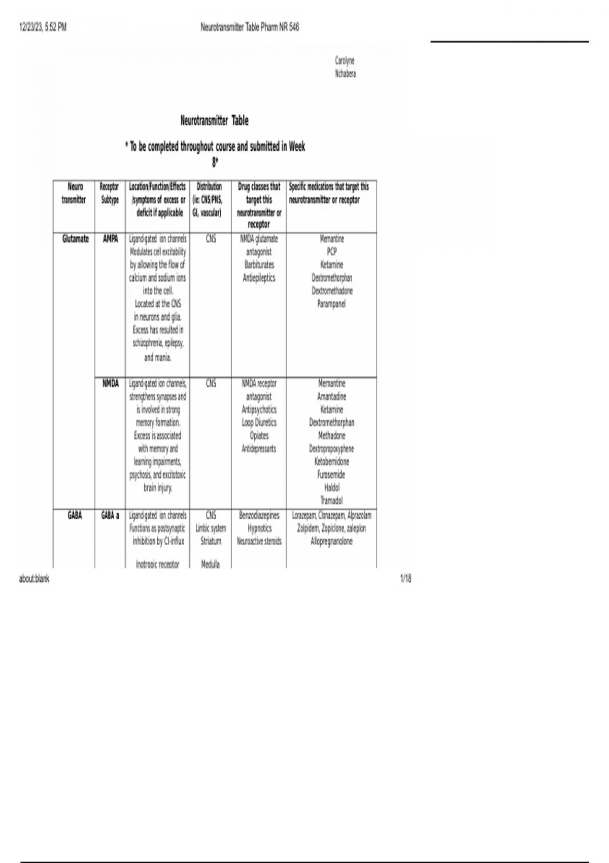 , 12/23/23, 5:52 PM Neurotransmitter Table Pharm NR 546