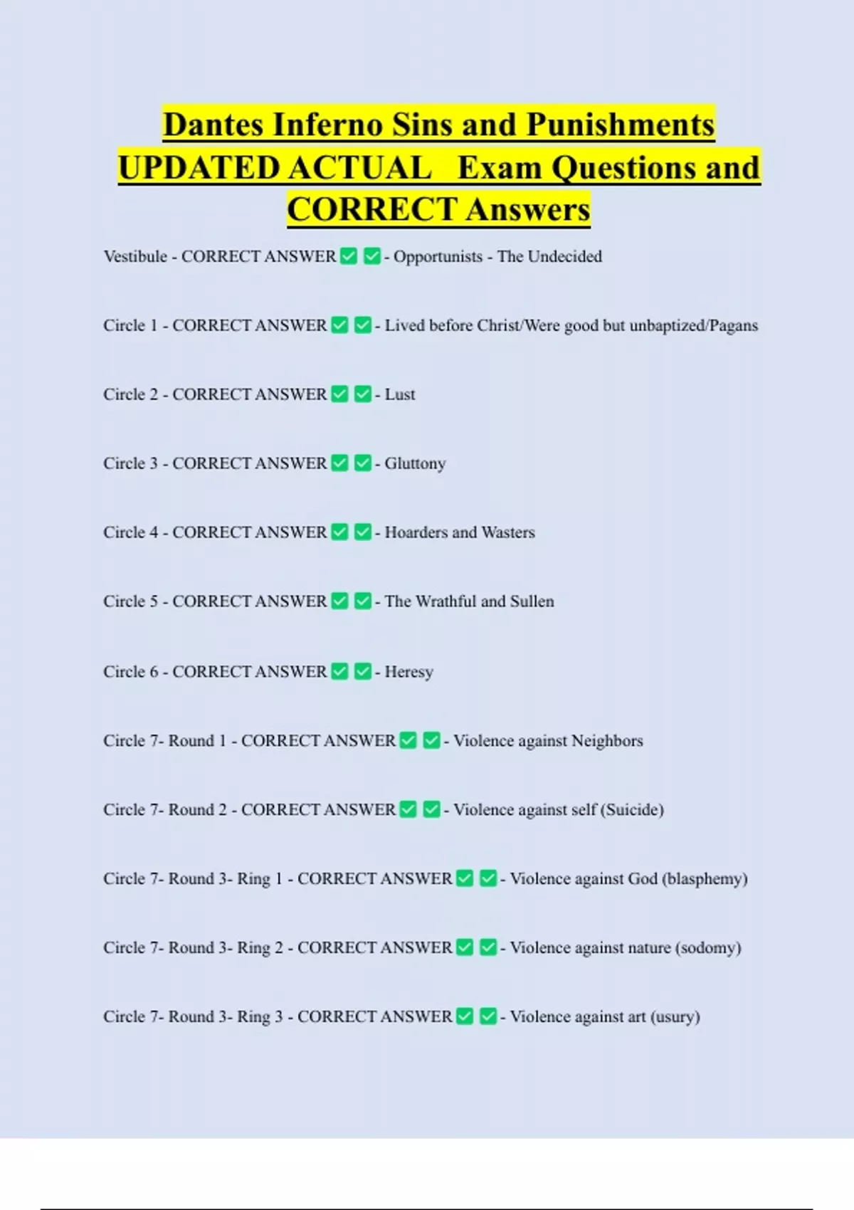 Dantes Inferno Sins and Punishments UPDATED ACTUAL Exam Questions and CORRECT Answers