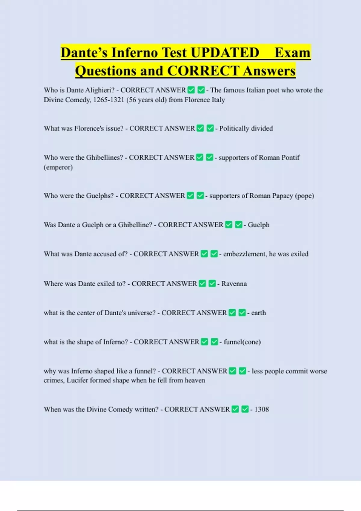 Dante’s Inferno Test UPDATED Exam Questions and CORRECT Answers Who is Dante Alighieri? - CORRECT ANSWER - The famous Italian poet who wrote the Divine Comedy, (56 years old) from Florence Italy What was Florence's issue? - CORRECT ANSWER Who were the Ghibellines? - CORRECT ANSWER (emperor) Who were the Guelphs? - CORRECT ANSWER - Politically divided - supporters of Roman Pontif - supporters of Roman Papacy (pope)
