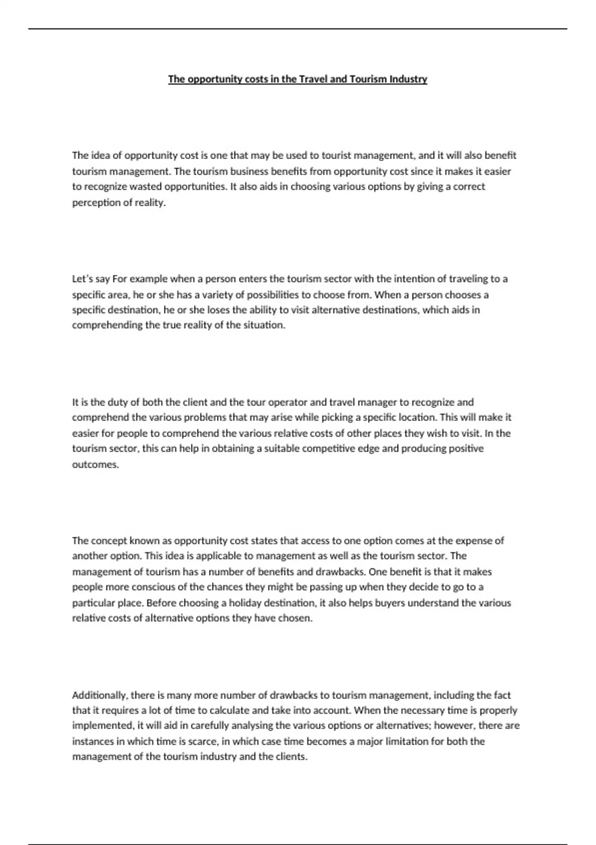 tourism management. The tourism business benefits from opportunity cost since it makes it easier