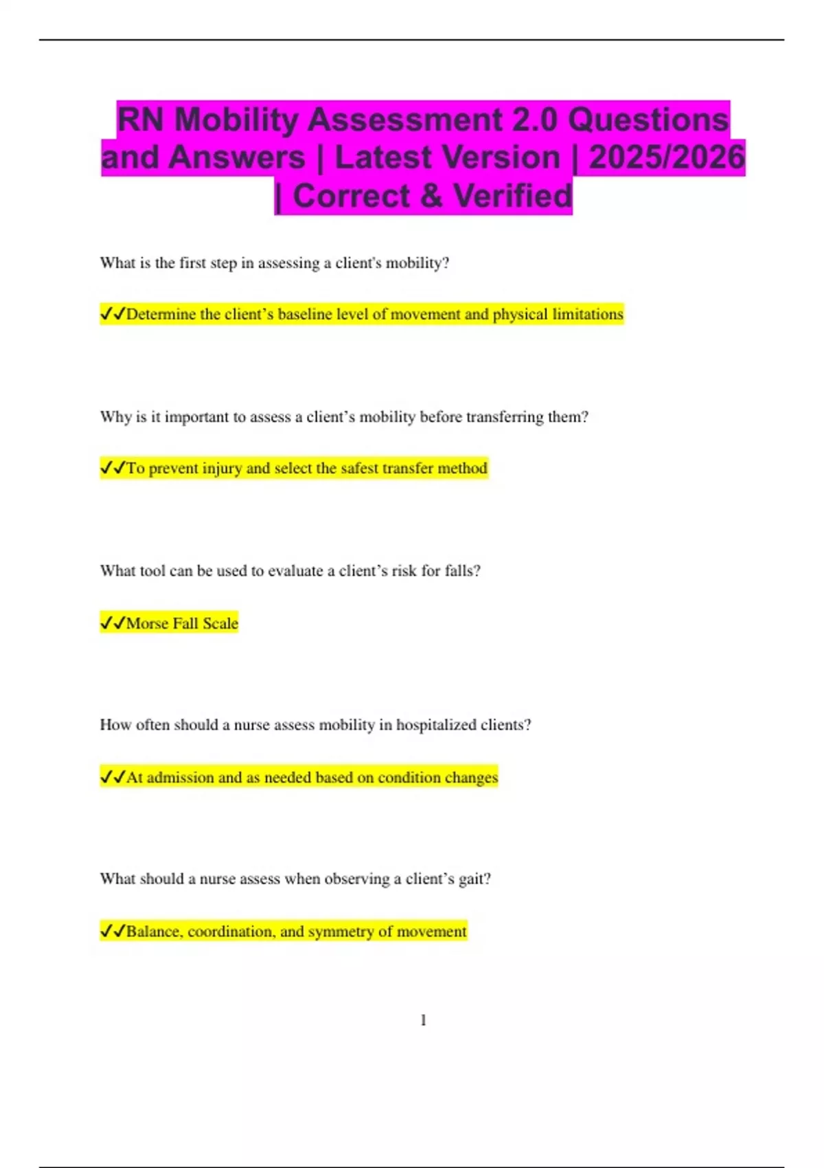 RN Mobility Assessment 2.0 Questions and Answers | Latest Version | 2025/2026 | Correct & Verified What is the first step in assessing a client's mobility? Determine the client’s baseline level of movement and physical limitations Why is it important to assess a client’s mobility before transferring them? To prevent injury and select the safest transfer method What tool can be used to evaluate a client’s risk for falls? Morse Fall Scale How often should a nurse assess mobility in hospitalized clients? At admission and as needed based on condition changes What should a nurse assess when observing a client’s gait? Balance, coordination, and symmetry of movement 2 What is a key sign of impaired mobility in an older adult? Unsteady gait or difficulty standing from a chair Why is it important to evaluate range of motion (ROM)? To assess joint flexibility and detect limitations What does active range of motion indicate? The client can move joints without assistance What is one indication for passive range of motion exercises? The client is unable to move a joint independently What is the nurse’s priority when a client reports dizziness upon standing? Assist them to sit or lie down immediately Why is it important to encourage ambulation in post-operative clients? To reduce the risk of complications such as pneumonia and blood clots 3 What should the nurse do if a client becomes weak while walking? Lower them gently to the floor to prevent a fall What is the best method to assess muscle strength during mobility assessment? Ask the client to push and pull against resistance How can a nurse evaluate a client’s balance? Have the client stand with feet together and eyes closed What should the nurse assess before ambulating a client with a walker? Ensure the walker is at the correct height and the client knows how to use it safely What is one indication that a client needs assistance with mobility? The client expresses fear of falling when walking What is the purpose of the “Timed Up and Go” test? To assess a client’s ability to rise, walk, and return safely 4 What should a nurse observe