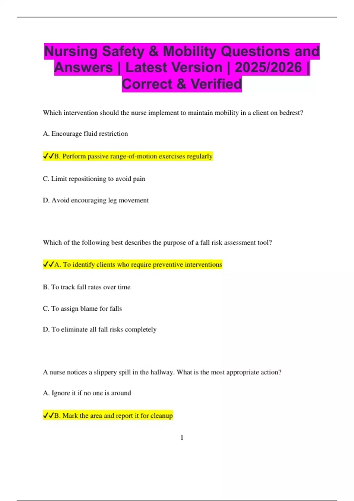 Nursing Safety & Mobility Questions and Answers | Latest Version | 2025/2026 | Correct & Verified
