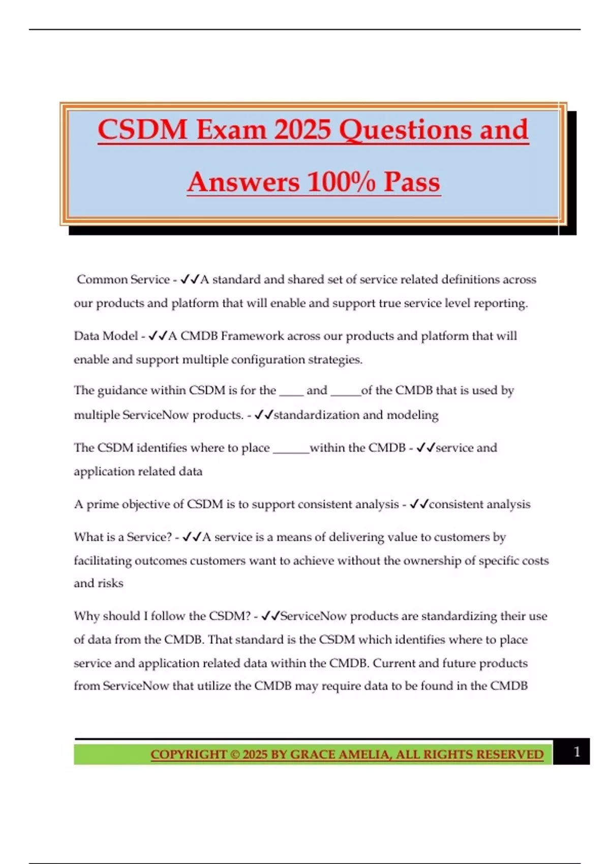 CSDM Exam 2025 Questions and Answers 100% Pass Common Service - A standard and shared set of service related definitions across our products and platform that will enable and support true service level reporting. Data Model - A CMDB Framework across our products and platform that will enable and support multiple configuration strategies. The guidance within CSDM is for the ____ and _____of the CMDB that is used by multiple ServiceNow products. - standardization and modeling The CSDM identifies where to place ______within the CMDB - service and application related data A prime objective of CSDM is to support consistent analysis - consistent analysis What is a Service? - A service is a means of delivering value to customers by facilitating outcomes customers want to achieve without the ownership of specific costs and risks Why should I follow the CSDM? - ServiceNow products are standardizing their use of data from the CMDB. That standard is the CSDM which identifies where to place service and application related data within the CMDB. Current and future products from ServiceNow that utilize the CMDB may require data to be found in the CMDB 2COPYRIGHT © 2025 BY GRACE AMELIA, ALL RIGHTS RESERVED framework identified within this white paper. Without CI data in these prescribed CMDB tables, you may not receive the full value of the ServiceNow platform. ServiceNow ships with three OOB service types. What are they? - The three OOB service types are application, business, and technical. Application service - is a service type that is a logical representation of a deployed application stack Business service - is a service type that is published to business users, and it typically underpins one or more business capabilities. Technical service - is a service type that is publish
