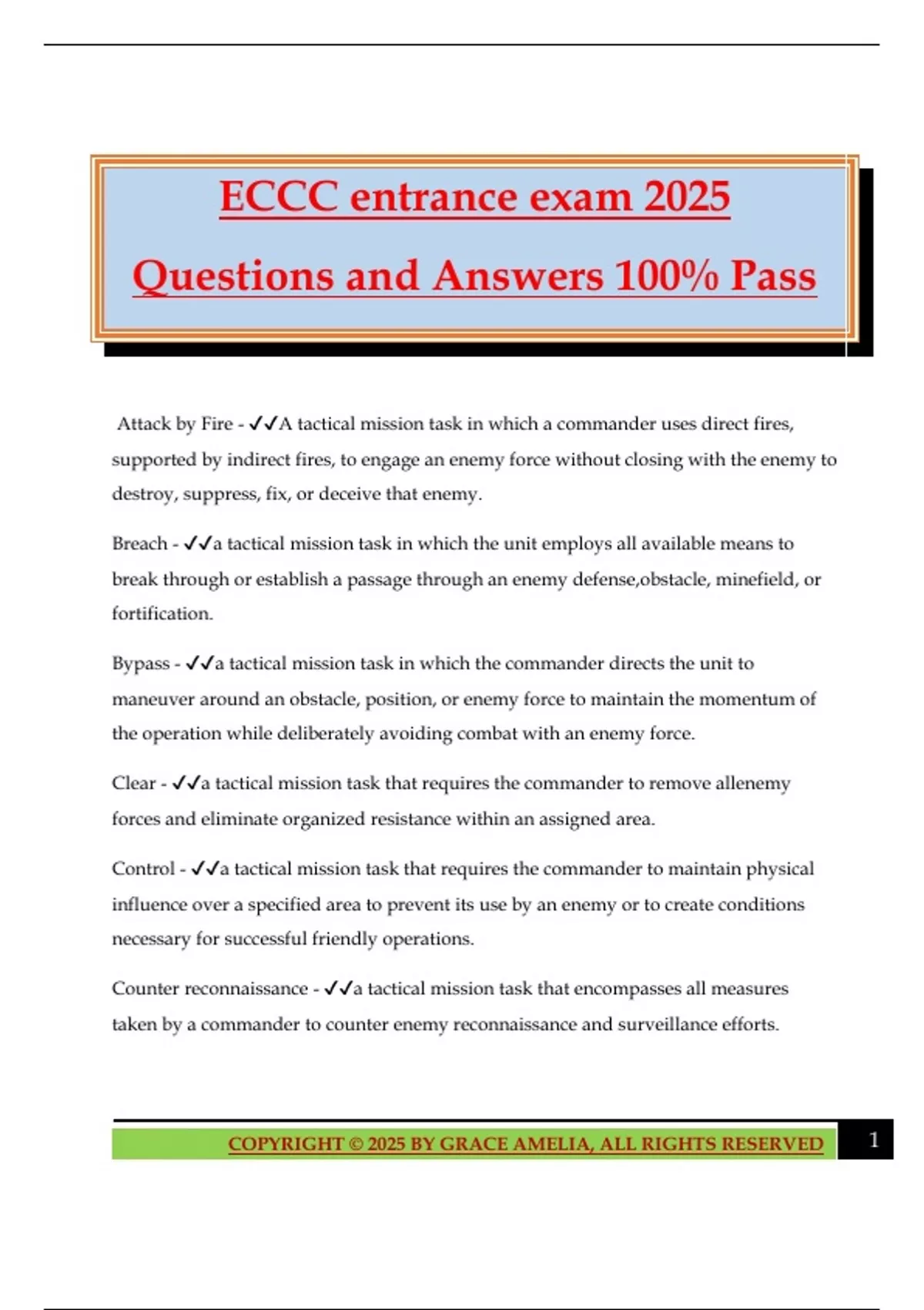 ECCC entrance exam 2025 Questions and Answers 100% Pass Attack by Fire - A tactical mission task in which a commander uses direct fires, supported by indirect fires, to engage an enemy force without closing with the enemy to destroy, suppress, fix, or deceive that enemy. Breach - a tactical mission task in which the unit employs all available means to break through or establish a passage through an enemy defense,obstacle, minefield, or fortification. Bypass - a tactical mission task in which the commander directs the unit to maneuver around an obstacle, position, or enemy force to maintain the momentum of the operation while deliberately avoiding combat with an enemy force. Clear - a tactical mission task that requires the commander to remove allenemy forces and eliminate organized resistance within an assigned area. Control - a tactical mission task that requires the commander to maintain physical influence over a specified area to prevent its use by an enemy or to create conditions necessary for successful friendly operations. Counter reconnaissance - a tactical mission task that encompasses all measures taken by a commander to counter enemy reconnaissance and surveillance efforts. 2COPYRIGHT © 2025 BY GRACE AMELIA, ALL RIGHTS RESERVED Counter reconnaissance is not a distinct mission, but a component of all forms of security operations Disengagement - a tactical mission task where a commanderhas the unit break contactwith the enemy to allow the conduct of another mission or to avoid decisive engagement Exfiltrate - a tactical mission task where a commander removes Soldiers or units from areas under enemy control by stealth, deception, surprise, or clandestine means. Follow and Assume - A tactical mission task in which a second committed force follows a force conducting an offensive task and is prepared to continue the mission if the lead force is fixed, attrited, or unable to continue. Follow and Support - A tactical mission task in which a committed force follows and supports a lead force conducting an offensive task. Occupy - a tactical mission task that i