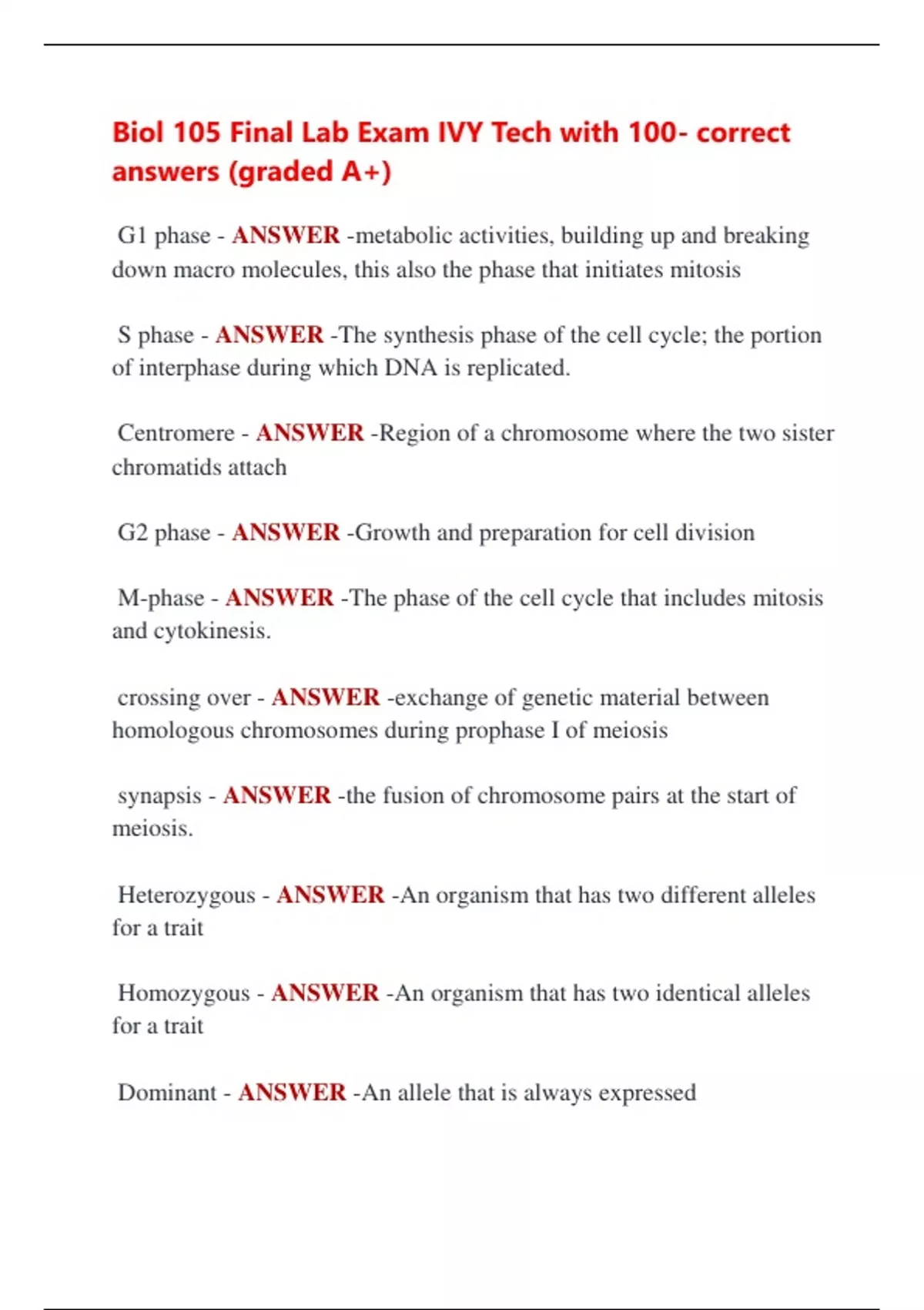Biol 105 Final Lab Exam IVY Tech with 100- correct answers (graded A+) G1 phase - ANSWER -metabolic activities, building up and breaking down macro molecules, this also the phase that initiates mitosis S phase - ANSWER -The synthesis phase of the cell cycle; the portion of interphase during which DNA is replicated. Centromere - ANSWER -Region of a chromosome where the two sister chromatids attach G2 phase - ANSWER -Growth and preparation for cell division M-phase - ANSWER -The phase of the cell cycle that includes mitosis and cytokinesis. crossing over - ANSWER -exchange of genetic material between homologous chromosomes during prophase I of meiosis synapsis - ANSWER -the fusion of chromosome pairs at the start of meiosis. Heterozygous - ANSWER -An organism that has two different alleles for a trait Homozygous - ANSWER -An organism that has two identical alleles for a trait Dominant - ANSWER -An allele that is always expressed Recessive - ANSWER -An allele that is masked when a dominant allele is present Trait - ANSWER -A characteristic that an organism can pass on to its offspring through its genes. Phenotype - ANSWER -An organism's physical appearance, or visible traits. Genotype - ANSWER -An organism's genetic makeup, or allele combinations. Allele - ANSWER -Different forms of a gene Gene - ANSWER -A segment of DNA on a chromosome that codes for a specific trait spontaneous generation - ANSWER -the mistaken idea that living things can arise from nonliving sources Biogenesis - ANSWER -the production of living organisms from other living organisms normal flora - ANSWER -bacteria which are found in or on our bodies on a semi-permanent basis without causing disease nutrient broth - ANSWER -commonly used liquid complex medium for culture growth Agar - ANSWER -solidifying agent for nutrient broth fastidious - ANSWER -Will not grown well in unsupplemented broth or agar heat fixing - ANSWER -kills the bacteria, makes them adhere to the slide, and coagulates cytoplasmic proteins to make them more visible Gram-positive bacteria - ANSWER -Bacteria that have a thick peptido glycan cell wall, and no outer membrane. They stain very darkly (purple) in Gram stain. Gram-negative bacteria - ANSWER -Bacteria that have a thin peptidoglycan cell wall covered by an outer plasma membrane. They stain very lightly (pink) in Gram stain. Gram-negative bacteria are typically more resistant to antibiotics than Gram-positive bacteria. What is the primary stain in gram staining ? - ANSWER -crystal violet Gram's iodine does what? - ANSWER -It is a mordant meaning it helps the stain attach to the cell better. What is the purpose of the ethanol in gram staining? - ANSWER -It is a decolorizing agent. In Gram negative cells the thinner layer of peptidogylcan has larger pores to allow for alcohol to penetrate and remove the aggregated crystal violet. The color remains in the Gram positive. The ethanol What is the secondary stain in gram staining? - ANSWER -Safranin which is trapped in the thin layer or peptidogylcan