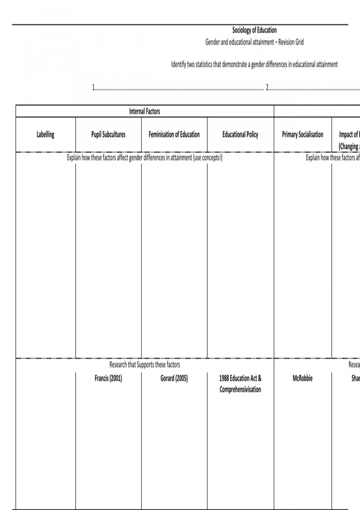Gender and educational attainment – Revision Grid
