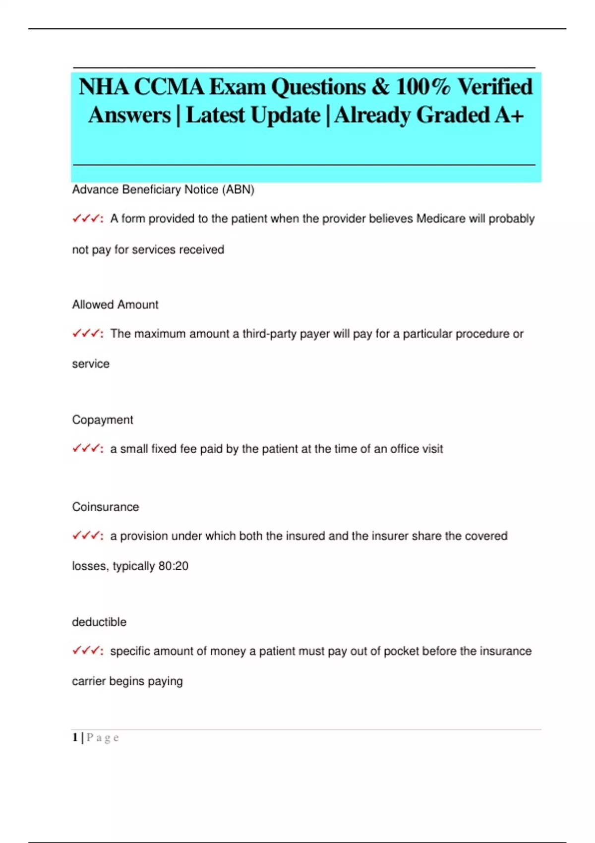 🗸🗸🗸: specific amount of money a patient must pay out of pocket before the insurance