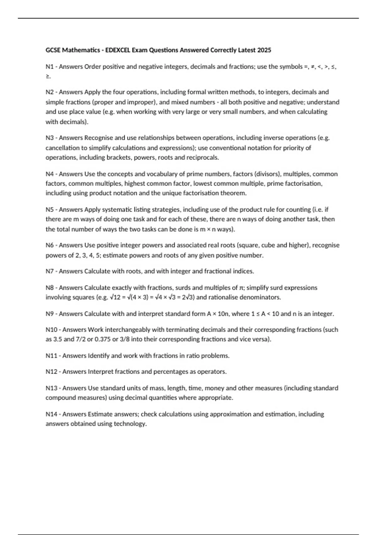 GCSE Mathematics - EDEXCEL Exam Questions Answered Correctly Latest 2025 N1 - Answers Order positive and negative integers, decimals and fractions; use the symbols =, ≠, <, >, ≤, ≥. N2 - Answers Apply the four operations, including formal written methods, to integers, decimals and simple fractions (proper and improper), and mixed numbers - all both positive and negative; understand and use place value (e.g. when working with very large or very small numbers, and when calculating with decimals). N3 - Answers Recognise and use relationships between operations, including inverse operations (e.g. cancellation to simplify calculations and expressions); use conventional notation for priority of operations, including brackets, powers, roots and reciprocals. N4 - Answers Use the concepts and vocabulary of prime numbers, factors (divisors), multiples, common factors, common multiples, highest common factor, lowest common multiple, prime factorisation, including using product notation and the unique factorisation theorem. N5 - Answers Apply systematic listing strategies, including use of the product rule for counting (i.e. if there are m ways of doing one task and for each of these, there are n ways of doing another task, then the total number of ways the two tasks can be done is m × n ways). N6 - Answers Use positive integer powers and associated real roots (square, cube and higher), recognise powers of 2, 3, 4, 5; estimate powers and roots of any given positive number. N7 - Answers Calculate with roots, and with integer and fractional indices. N8 - Answers Calculate exactly with fractions, surds and multiples of π; simplify surd expressions involving squares (e.g. √12 = √(4 × 3) = √4 × √3 = 2√3) and rationalise denominators. N9 - Answers Calculate with and interpret standard form A × 10n, where 1 ≤ A < 10 and n is an integer. N10 - Answers Work interchangeably with terminating decimals and their corresponding fractions (such as 3.5 and 7/2 or 0.375 or 3/8 into their corresponding fractions and vice versa). N11 - Answers Identify and work with fractions in ratio problems. N12 - Answers Interpret fractions and percentages as operators. N13 - Answers Use standard units of mass, length, time, money and other measures (including standard compound measures) using decimal quantities where appropriate. N14 - Answers Estimate answers; check calculations using approximation and estimation, including answers obtained using technology. N15 - Answers Round numbers and measures to an appropriate degree of accuracy (e.g. to a specified number of decimal places or significant figures); use inequality notation to specify simple error intervals due to truncation or rounding. N16 - Answers Apply and interpret limits of accuracy, including upper and lower bounds. Algebraic Manipulation - Answers Using symbols to represent mathematical operations. Coefficient - Answers A numerical factor in a term. Surds - Answers Irrational numbers expressed with roots. Binomial - Answers A polynomial with two terms. Quadratic Expression - Answers An expression of the form ax² + bx + c.