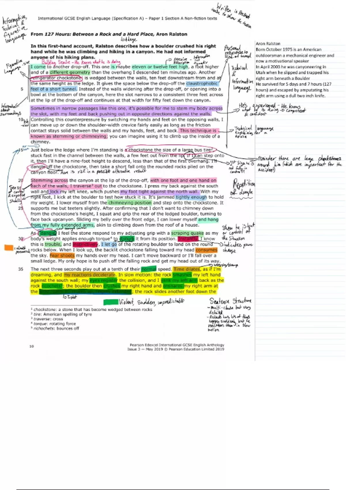 For Pearson Edexcel IGCSE English Language (specification A). From: Part 1: Paper 1 Section A Non-fiction texts. 127 Hours: between a rock and a hard place by Aron ralston annotated text. (If any of the annotations are illegible/too small to read, message me and I'll send a close-up or tell you what I meant to write)
